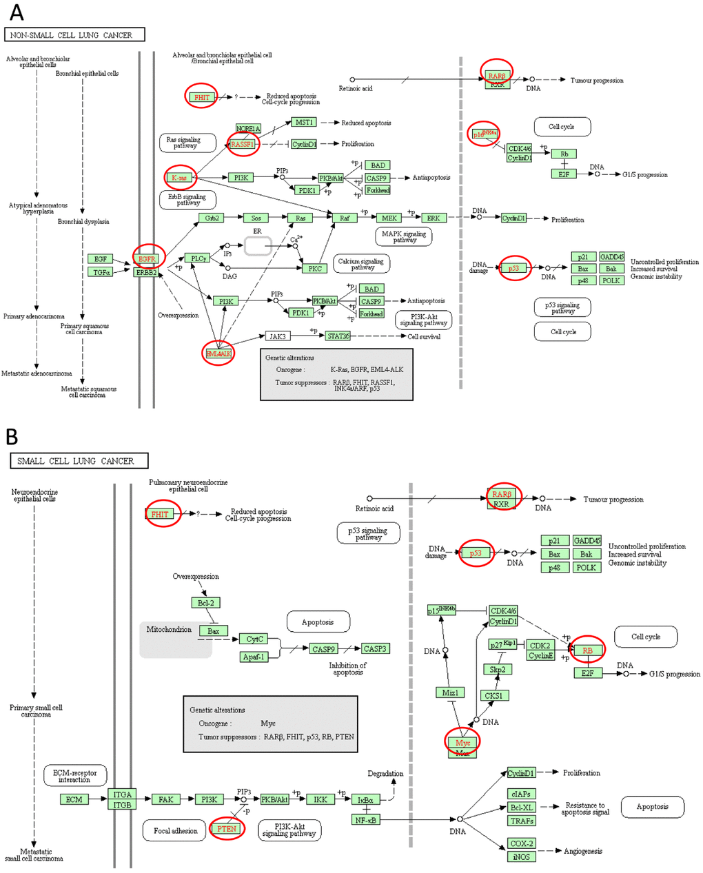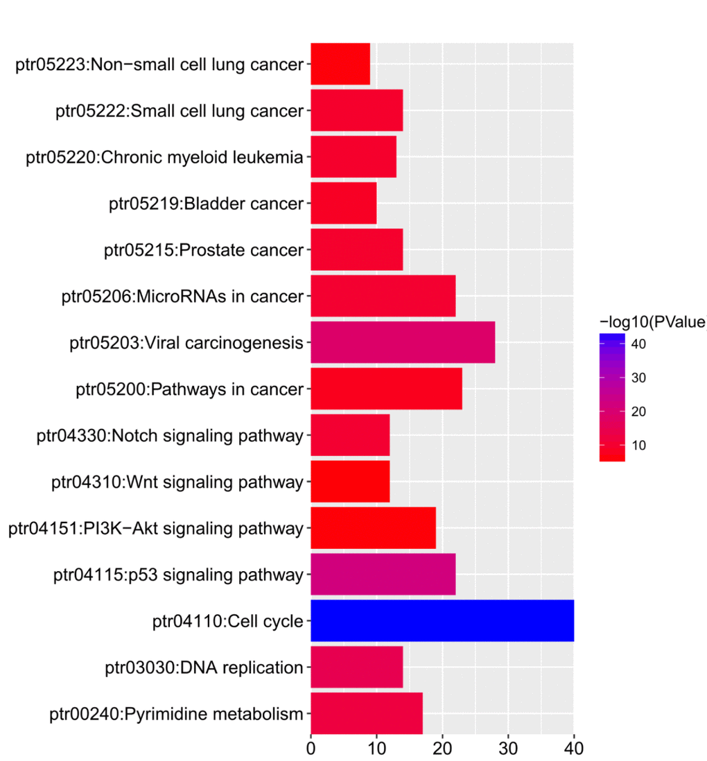 KEGG analysis can define the pathways related to the functions of E2F alterations and the frequently altered neighbor genes. Fifteen pathways related to the functions of E2F alterations in lung adenocarcinoma were found through KEGG analysis (Figure 8). Among these pathways, ptr05223:NSCLC, ptr05222:SCLC, ptr05200:pathways in cancer, ptr04151:PI3K–Akt signaling pathway, ptr04310:Wnt signaling pathway, and ptr04330:Notch signaling pathway were involved in the tumorigenesis and pathogenesis of lung adenocarcinoma (Figures 9A and B).