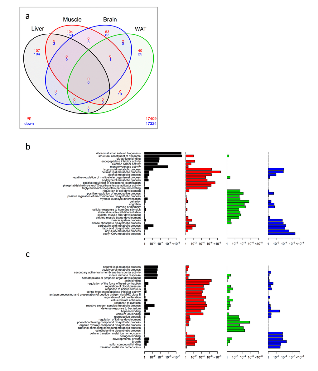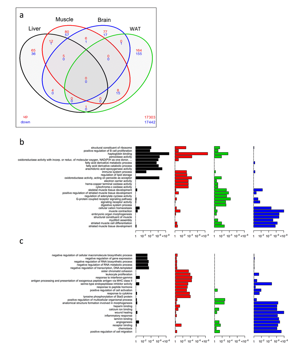 From the significantly up/down differentially expressed genes (as determined by Cuffdiff [38] with FDR < 10%), we first employed a four-way Venn analysis to examine overlap at the single gene level across liver, skeletal muscle, brain and WAT tissues within KOAL mice at 15 months of age. In general, few genes showed commonality across tissues. No single gene was differentially expressed within KOAL mice across all four tissues (Fig. 1a and Table S1), although five genes encoding the ribosomal proteins Rpl37a, Rps26, Rpl31 and the haemoglobin proteins Hba-a1 and Hbb-bt were up-regulated in common across liver, skeletal muscle and brain. The greatest transcriptional overlap was observed between skeletal muscle and WAT; eight common genes were up-regulated including genes involved in fatty acid metabolism and thyroid hormone regulation such as Elovl6 and Thrsp, and Lmod1, and 15 common genes were down-regulated including those involved in inflammation and angiogenesis such as Serpina3n, Serpina3c, Thbs2, and Mest/Peg1. The next largest overlap in terms of common genes was between liver and skeletal muscle, with 12 genes up-regulated including those involved in oxygen transport and cell cycle exit, such as Hba-a2, Hbb-bs and Cdkn1a. We further annotated the biological function from the enriched set of up- (Fig. 1b and Table S2) or down-regulated (Fig. 1c and Table S3) genes within our KOAL mice by generating Gene Ontology (GO; both Biological Processes and Molecular Functions) categories. Within the liver, significant GO terms in the up-regulated category included structural constituents of the ribosome, positive regulation of B cell proliferation, haptoglobin binding and fatty acid derivative metabolic/catabolic processes, whereas in the down-regulated category significant GO terms included negative regulation of RNA metabolic processes. Within skeletal muscle, structural constituents of ribosome and haptoglobin binding were again over-represented in the up-regulated gene category along with several GO terms linked to mitochondrial processes, including oxidoreductase activity, electron carrier activity and cytochrome-c oxidase activity. In the down-regulated category, several GO terms linked with inflammatory processes, including response to leucocyte proliferation, response to interferon-gamma and serine-type endopeptidase inhibitory activity were over-represented. Within the brain, in common with liver and muscle the GO categories structural constituents of ribosome, haptoglobin binding and peroxidase activity were identified, alongside those for regulation of adenylate cyclase activity and G-protein coupled receptor signalling were overrepresented in the up-regulated genes. GO categories for anatomical structure formation involved in morphogenesis and angiogenesis were overrepresented within the down-regulated genes in brain. GO terms in WAT linked to muscle contraction, striated muscle cell differentiation and myofibril assembly were identified in the up-regulated gene category, while terms including heparin binding, inflammatory response and wound healing were identified within the down-regulated gene set.