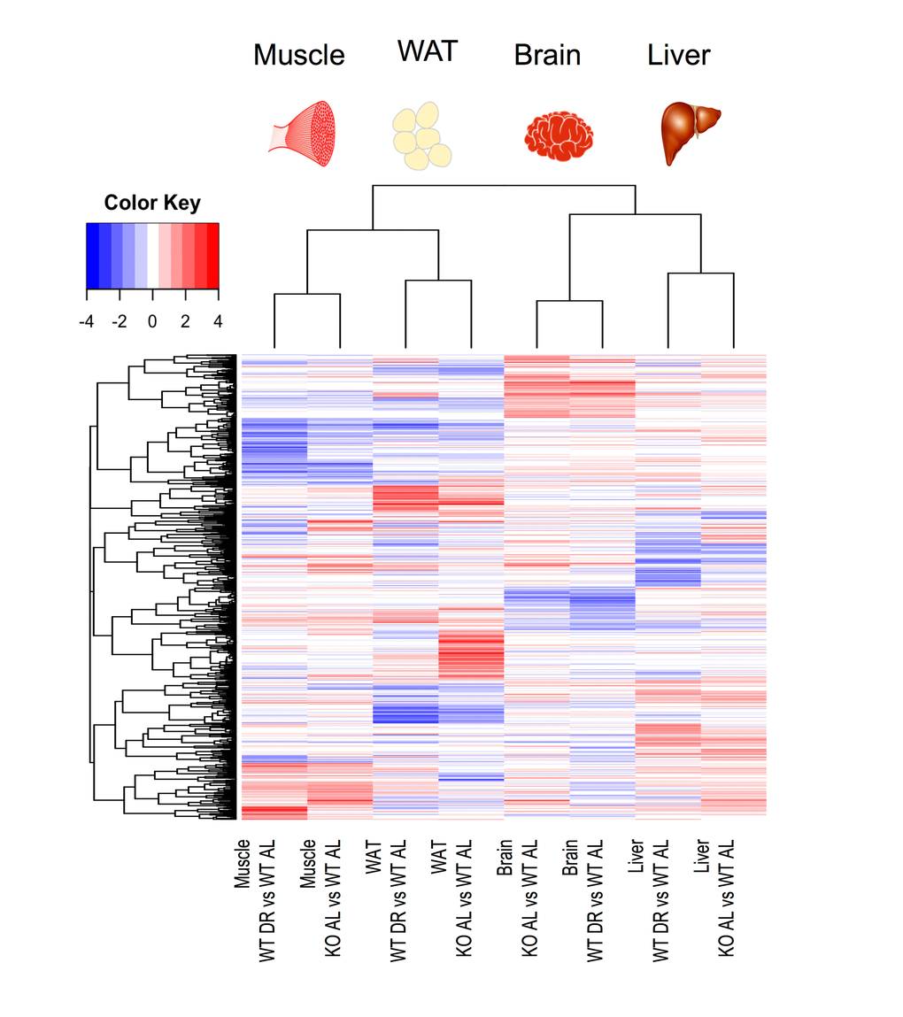 In the present study we identified transcriptional signatures within liver, skeletal muscle, brain and inguinal white adipose tissue and measured metabolic parameters in two established mouse models of longevity; genetic global knockout of IRS1 (Irs1-/-, KOAL) and dietary restriction (WTDR) and in Irs1-/- mice subject to 12 months of 30% DR (KODR). We observed very little transcriptional overlap between tissues within either KOAL or WTDR. Such tissue-specific differences within our long-lived models is supported by a recent transcriptomic and proteomic studies in rodents [39,40] and in long-lived IIS mutant flies [41], and indicates that the underlying processes that act overall to modulate longevity and affect healthspan may act independently on specific organs and tissues.