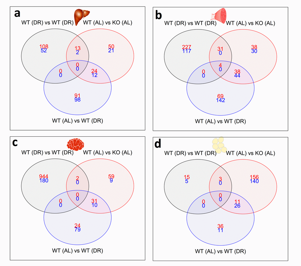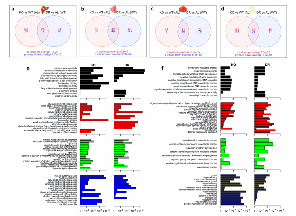 We next investigated the number of common and distinct genes significantly differentially expressed between KOAL and WTDR mice, which are summarised by a heatmap of the tissue-specific response in KOAL mice and in WTDR mice, both relative to WTAL mice (Fig. 3; based on the average log2 difference between each of the conditions reported). A total of 1172 genes were significantly differentially expressed (FDR-adjusted p value < 10%) in at least one model and in one tissue. The number of common and distinct genes significantly differentially expressed (q<0.1) between KOAL and WTDR mice are summarised using individual Venn diagrams for liver, skeletal muscle, brain and WAT (Fig. 4a-d; with the numbers in the bottom far right of each Venn diagram denoting the number of genes expressed but not significantly up-regulated (red) or down-regulated (blue) by either condition. For all tissues, there was highly significant overlap between KOAL and WTDR mice using the Fisher exact test in both up-regulated (red) and down-regulated (blue) genes. More transcriptional overlap in terms of number of genes significantly altered was observed between KOAL mice and WTDR mice in skeletal muscle (42 up/44 down), than in brain (31/10), WAT (11/26) or liver (24/12). In all tissues there were more genes that were unique to KOAL or WTDR mice than genes that showed commonality across both models (Fig. 4). In KOAL mice the number of genes differentially expressed for each tissue were as follows; brain (92 up/19 down), liver (87/37), muscle (111/74) and WAT (173/171). In WTDR mice, the number of genes differentially expressed within each tissue was as follows; brain (55/89), liver (115/110), muscle (111/186) and WAT (47/37) (Fig. 4a-d and Table S7).