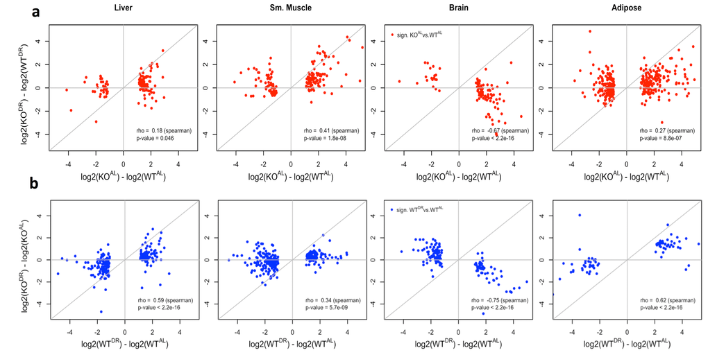 Additionally, genes in liver, skeletal muscle and WAT that were significantly differentially expressed between WTALand KOAL also tended to be differentially expressed (although not always significantly) when comparing WTAL and WTDR comparison. If the loss of IRS1 and the effects of DR on gene expression were additive, then the expectation would be that the magnitude of gene expression change between the extremes (WTAL and KODR) would be greater than the changes between WTAL and KOAL. Instead, the data suggested a plateau for gene expression changes, except in the brain where changes associated with the loss of IRS1 were clearly suppressed under DR (Fig. S3a, S4). Again similarly, gene expression changes associated with DR conditions appeared to reach a plateau in KO mice. The correlation between genes significantly differentially expressed between WTAL and WTDR compared to the fold change between the two extreme conditions (WTAL and KODR) had a similar fold change magnitude in the liver, skeletal muscle and WAT, whereas changes in brain had a smaller magnitude of change in Irs1-/- mice (Fig. 3b, S4).