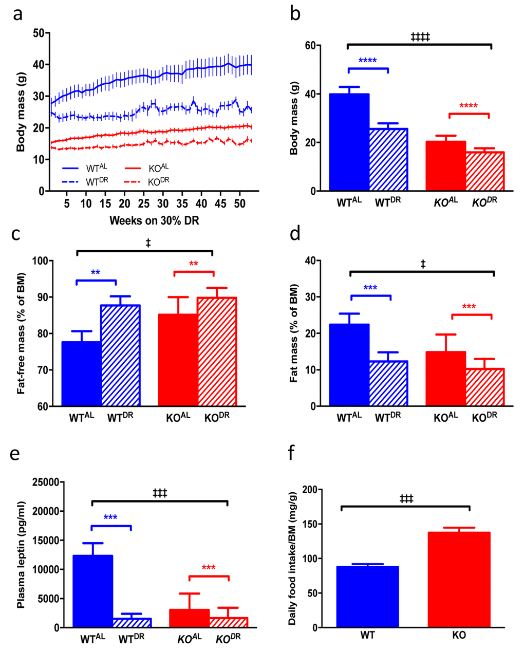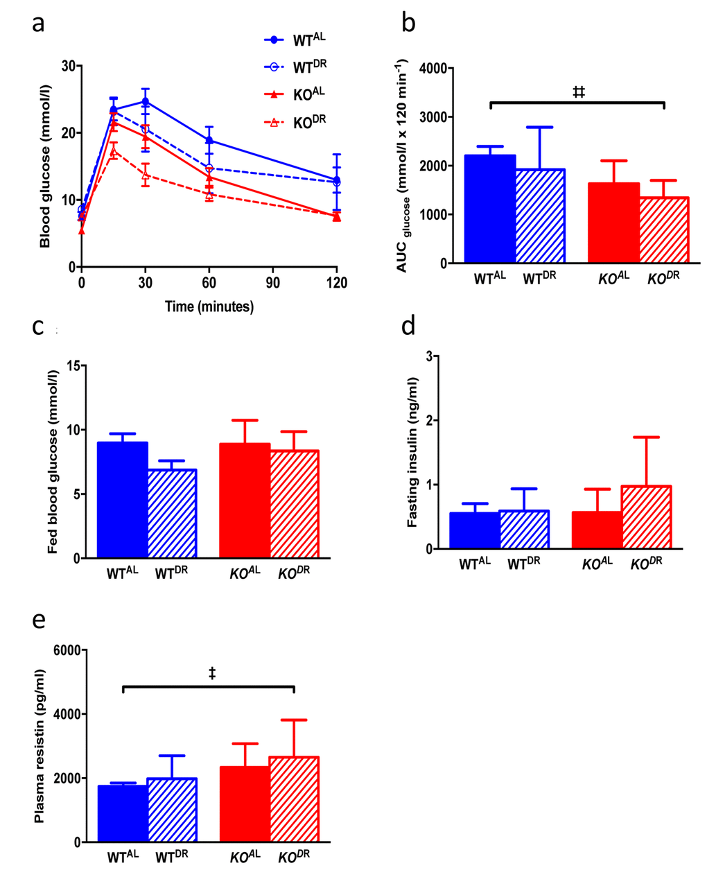 When KOAL mice were maintained on a normal chow diet they were significantly lighter, leaner and had significantly reduced plasma leptin levels compared to WTAL mice, despite being hyperphagic (Fig. 7 a-f). Following 12 months of 30% DR, body mass (F=38.38, p<0.0001) was significantly reduced in both (WTDR) and (KODR) mice relative to their appropriate ad libitum controls (Fig. 7a; WTAL and KOAL respectively). However, upon completion of the study the weight loss in WTDR mice was greater (36% loss relative to WTAL) compared to KODR mice (21% loss relative to KOAL) (Fig. 7b; interaction, F=10.97, p=0.002). Fat-free mass (% BM) was higher in DR mice, regardless of genotype, with KO mice having more fat-free mass compared to WT mice (Fig. 7c; genotype F=7.135, p=0.014; treatment F=12.667, p=0.002). In addition, DR further reduced fat mass (% of BM) in the already lean KO mice (Fig. 7d; genotype F=6.467, p=0.0185; treatment F=15.24, p=0.0008). Plasma leptin levels (Fig. 7e) were similarly affected by genotype (F= 18.845, p<0.001) and treatment (F=33.478, p<0.001), although a significant interaction existed between genotype and treatment (F=19.879, p<0.001), with the magnitude of the effect of DR on leptin levels being much greater in the WT mice. Mass-corrected food intake of KOAL mice was significantly higher (F=6.065, p<0.0001) than WTAL mice at 15 months of age (Fig. 7f). Glucose tolerance was significantly enhanced in KO mice relative to WT mice at 15 months of age (F=11.031, p=0.002; Fig. 8a, b), although there was no additional benefit of DR on glucose tolerance in either genotype (F=3.148, p=0.084). Fed blood glucose (Fig. 8c) levels were unaffected by genotype (F=1.075, p=0.306) and treatment (F=3.923, p=0.055), as was the case for fasting insulin levels (Fig. 8d; genotype F=0.867, p=0.358; treatment F=3.106, p=0.086). A significant genotype effect (F=5.023, p=0.031), but no treatment effect (F=1.252, p=0.270), was seen in plasma resistin levels (Fig. 8e).