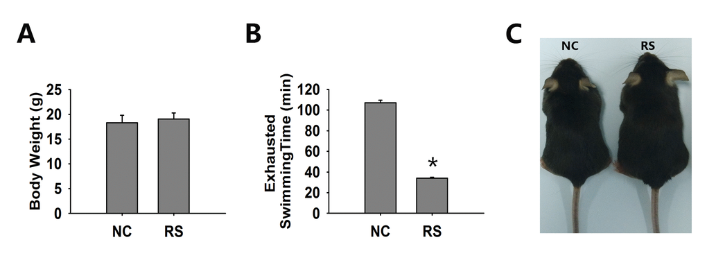 We evaluated the general conditions and physiological function of the two groups of mice. The outcomes of the physiological parameters were analyzed and are summarized in Fig. 1. The body weight of the RS group did not increase significantly after ten cycles of RS (Fig. 1A). We used the exhausted swimming time to represent physical strength and found that the strength of the RS group mice was markedly decreased (Fig. 1B). A photo of the two groups of mice is shown in Fig. 1C.