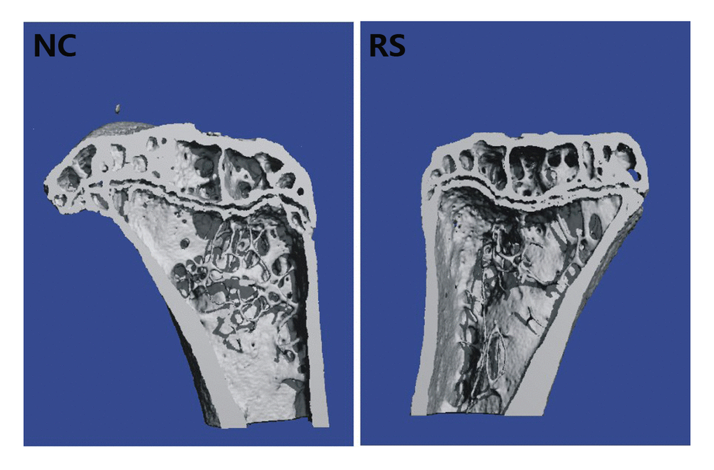 Osteoporosis, which is characterized by changes in the architecture of bone, is the most common consequence of menopause. We examined the bone mass to evaluate the effect of the ovary in the repeated super-ovulated mice on the skeletal system. Six months after modeling, the architecture of bone in each group was investigated using the SCANCO Micro-CT50 (SCANCO Medical) equipped system through trabecular bone analysis (Fig. 2, Table 1). The trabecular bone volume (BV), number of trabeculae (TbN), connectivity density (ConnD), trabeculae thickness (TbTh) and structure model index (SMI) in the tibia showed no significant differences between the two groups. However, the trabeculae separation (TbSp) was outstandingly increased in the tibia of the RS group mice compared with that of the NC group. These changes agreed well with the observed reduced bone mineral density (BMD), which is directly related to the material stiffness of the bone.