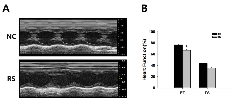 Gender differences exist in cardiovascular disease risk, beyond the protective effect of estrogens, mostly burdening postmenopausal females [17]. Mortality rates of cardiac vascular disease remain higher in women than in men despite the increased awareness of cardiovascular risk factors over recent decades. Estrogens have a protective role in this regard in premenopausal women. However, after the decrease in estrogen levels, women are exposed to the same, or even higher, cardiovascular risks as males [18,19]. Because of this, we examined the echocardiography of the mice, especially the ejection fraction (EF) and fractional shortening (FS), which are the two most commonly used parameters for estimating cardiac function, in the two groups using a Vevo®1100 Imaging system. The representative ultrasonic cardiogram reflected left ventricular function of the heart in both groups of mice (Fig. 3A). Our results indicated that ventricular systolic function declined in the RS group mice. We also found that EF significantly decreased in the RS group compared with the NC group (Fig. 3B). No significant difference in FS was observed between the groups of mice.
