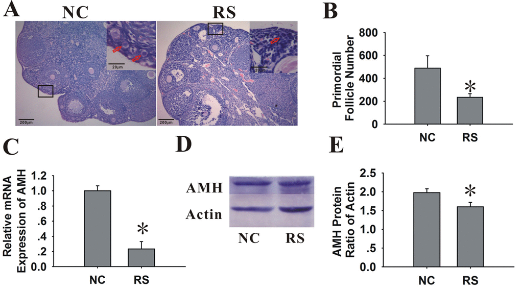 We further tested the effect of RS on the ovarian reserve and the size of primordial follicle pool. The expression level of AMH, which was only produced by the granulosa cells of primary, preantral and small antral follicles, could represent the number of growing follicles [20]. AMH has been demonstrated to be an ideal marker of ovarian reserves [21–25]. In addition to AMH, the ovarian primordial follicle pool, which serves as a source of developing follicles, is another ideal parameter to evaluate the ovarian reserve [26,27]. Therefore, in this study, we used both the AMH expression and numbers of primordial follicles to reflect the ovarian reserve, evaluating the effect of RS on the ovarian follicular quantity.