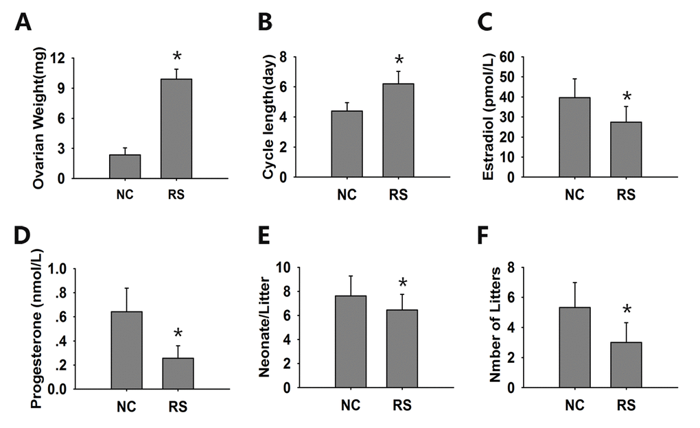 Menstrual changes are considered an early manifestation of ovarian dysfunction. During the menopausal transition, menstrual cycle regularity is progressively lost due to insufficient numbers of FSH-sensitive follicles that are present at any time in the ovaries [35,36]. The cycles of older mice became lengthened, and then they lose the capacity for cyclicity. Most of the vaginal lavages from acyclic mice were leukocytic (i.e., diestrus or metestrus-2) [37]. In our study, the length of the ovarian cyclicity of RS mice was obviously extended, which was paralleled with decreases in the follicle number. Current evidence suggests that the estradiol level decreases relatively late in the process of ovarian aging, and the plasma concentration of progesterone does not change significantly [38–40]. Our results showed that the plasma concentration of estradiol and progesterone decreased in the RS group mice. These results indicated that the ovarian endocrine function in the RS mice declined significantly.