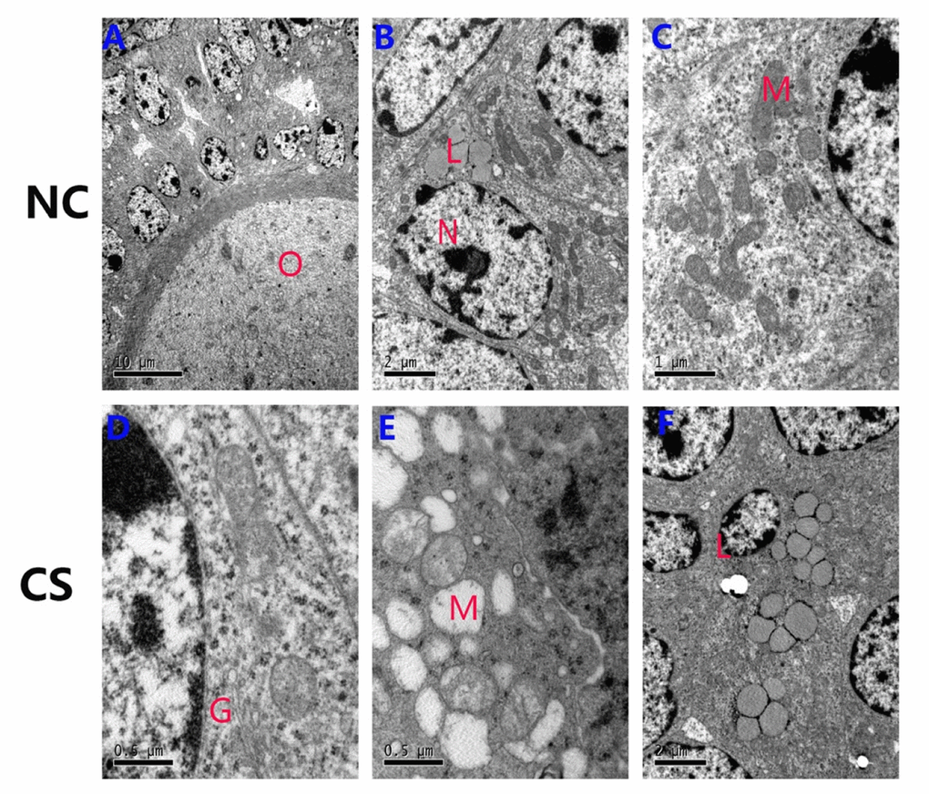 To analyze the impact of RS on organizational structure, we viewed ultrastructural changes of the ovaries using electron microscopy (Fig. 6A-F). Analysis of the two groups indicated that the mean areas of the GC and GC nuclei were not significantly different (Table 2). However, a marked difference was observed between the NC and RS groups when mitochondrial morphology was compared. In the NC group, cristae were clearly visible and appeared tubular, whereas in most cells of the RS group, the cristae morphology could not be easily identified because highly electron- dense matrix and cristae were barely visible. Mitochondria in some cells became swollen and showed vacuolization and degeneration of the cristae and matrix in the RS group. Moreover, the amounts of lipid droplets and swollen Golgi apparatuses increased significantly in the RS group.