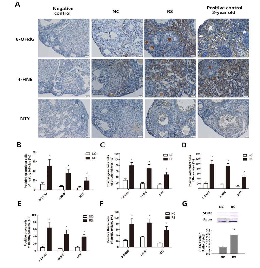 Oxidative lipid (4-HNE), protein (NTY), and DNA (8-OHdG) damage in interstitial cells and follicles of super-ovulated mice were measured. These molecules are widely accepted as biomarkers of oxidative DNA, protein, and lipid damage, respectively, in biological systems [28]. We observed that the expression levels of 8-OHdG, 4-HNE and NTY were all increased in the ovarian interstitial cells of RS mice (Fig. 7A). The percentage of follicles with positive staining for the indicated marker in the granulosa cells or theca cells of healthy and atretic follicles was significantly increased compared with the NC group (Fig. 7B-E). Oxidative damage markers in interstitial cells also increased when compared with the NC group mice (Fig. 7F). SOD2 is one of the most important antioxidant enzymes in all tissues due to its role in defense against oxidative stress, and its expression was upregulated when oxidative stress occurred. Analysis of the expression of this enzyme in both groups showed that repeated ovulation markedly increased the ovarian expression of this enzyme (Fig. 7G).