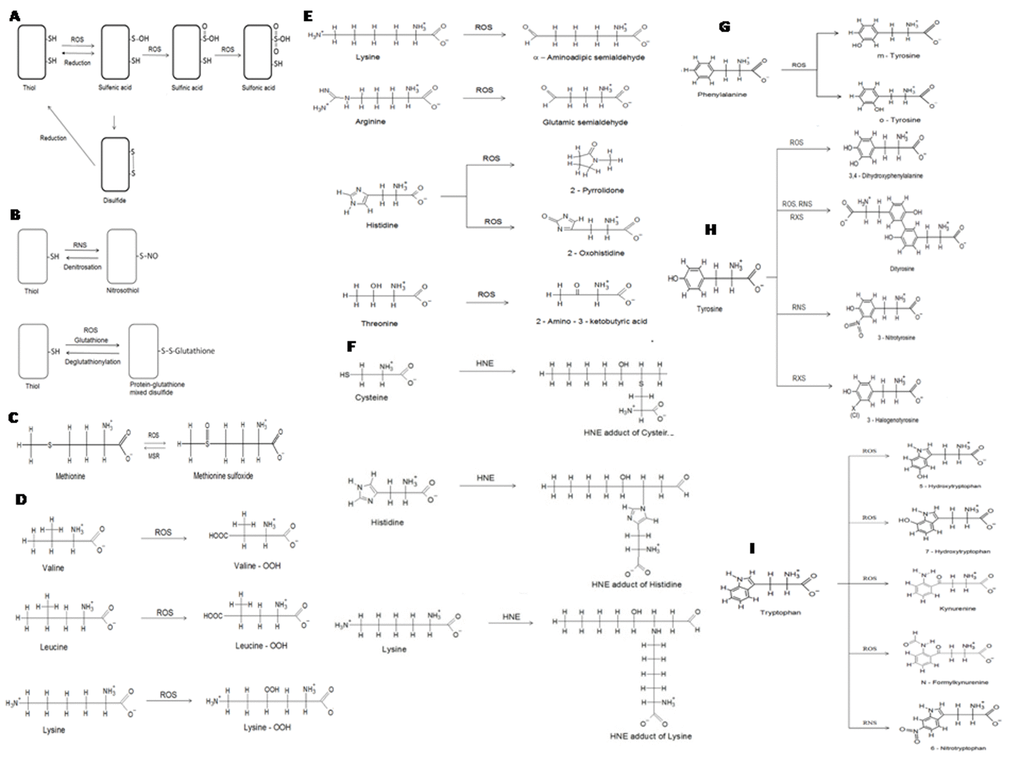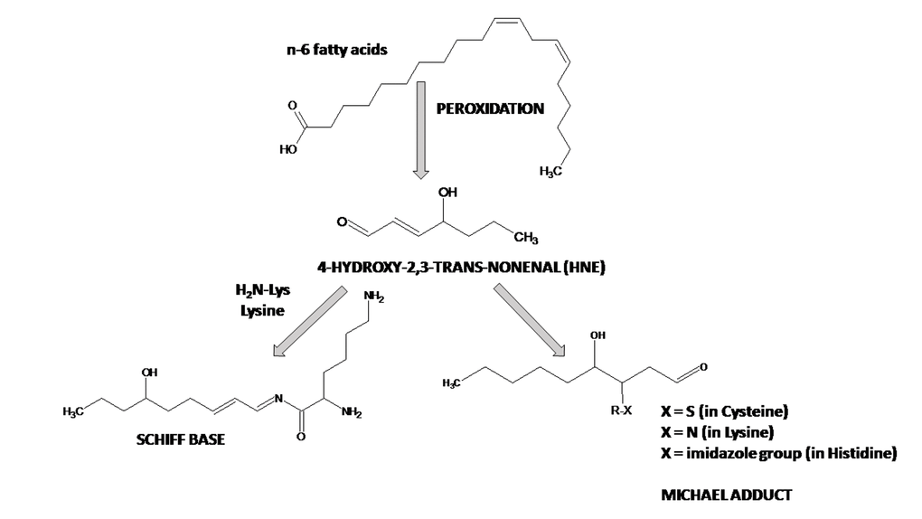 | Lysine, cysteine, histidine | Formation of carbonyl derivatives by secondary reaction with reactive carbonyl compounds derived from oxidation of carbohydrates (glycoxidation products), lipids (MDA, 4-HNE, ACR) and advanced glycoxidation and lipoxidation end products | Irreversible |