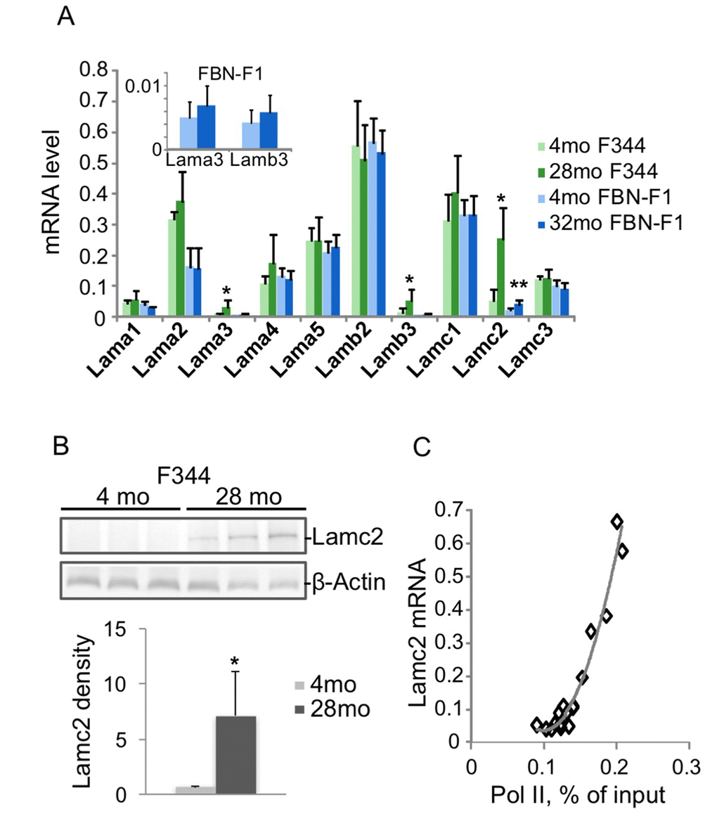 To distinguish between common versus genotype-specific changes in laminin gene expression during aging, we used F344 and FBN-F1 rat lines, two established model systems supported by the National Institute of Aging (NIA). As life spans of these two rat lines are substantially different, we compared young animals (4 months old, 4 mo) to animals at the age corresponding to their median life span (50% survival), which is close to 24 months for F344 rats and 32 months for FBN-F1 rats [14]. 28 mo F344 rats (10% survival) were also used to examine progression of changes with aging.