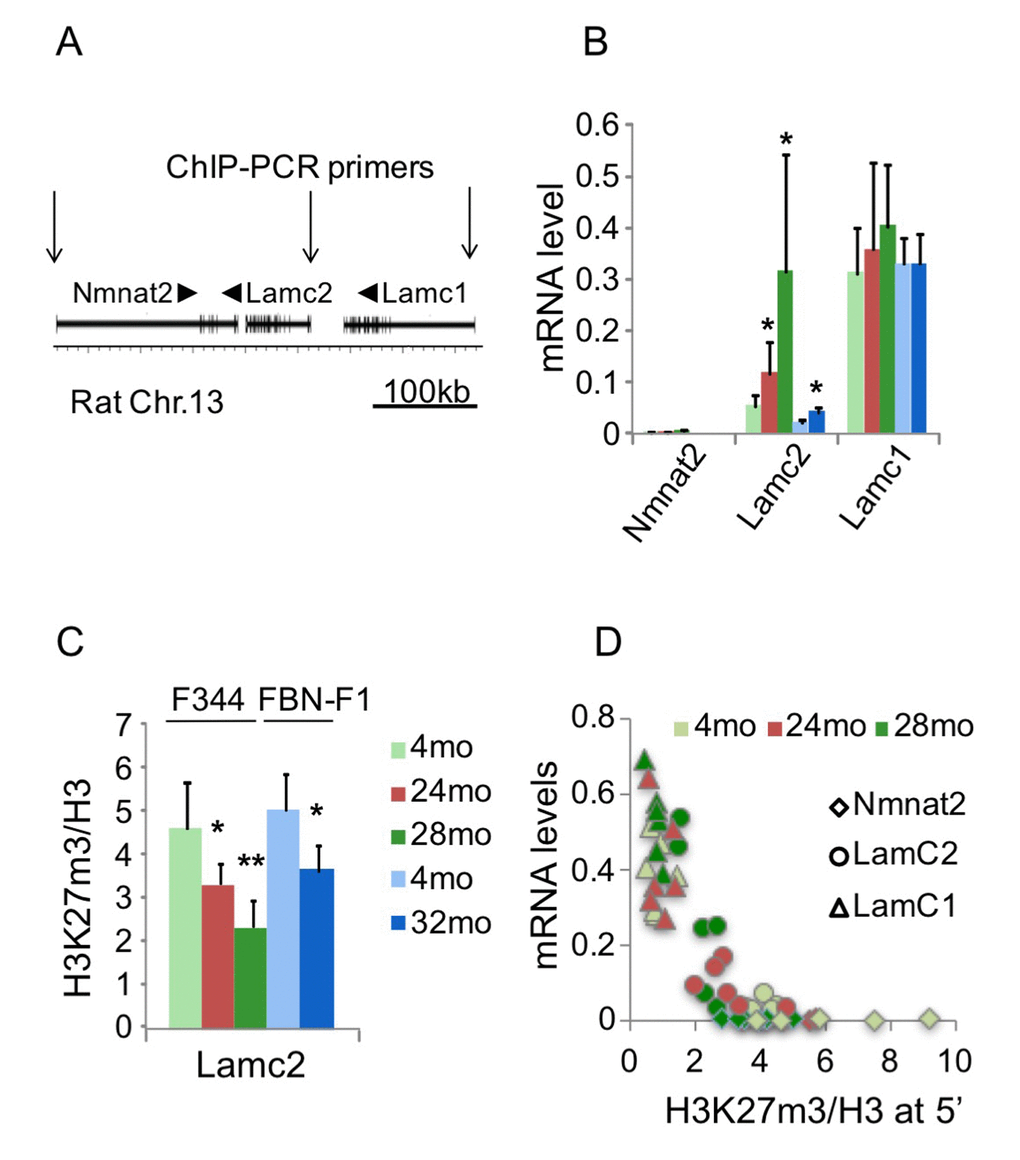To define the role of epigenetic processes in the deregulation of laminin gene expression in aging kidneys, we used Matrix ChIP assay [15] with antibodies to several histone modifications. Rat Lamc2 gene is located on chromosome 13 between Nmnat2 and Lamc1 genes (Figure 2A). Within this genomic region, Lamc1 gene is well expressed in young kidneys and shows no changes with aging. In contrast, Lamc2 is a low-abundance transcript in young kidneys, and its expression is significantly induced in old kidneys independent of genetic background (Figure 1A and 2B). Nmnat2 gene expression was not detected in kidneys of any age group (Figure 2B). Previous analysis showed that in different cell types and tissues, Lamc1 gene contains active histone marks, whereas Nmnat2 and Lamc2 reside within a silenced domain [16]. Thus, the Nmnat2-Lamc2-Lamc1 locus seems to be an attractive model of aging-associated chromatin changes in sections of the mammalian genome containing arrays of neighboring silenced and active domains.