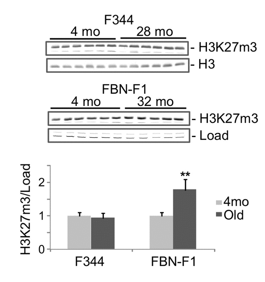 ChIP analysis of histone modification profiles revealed little or no changes in H3K4m3 density at Lamc1, Lamc2 and other laminin genes in old compared to young kidneys (not shown). There were also some decreases in H3K9m3, H3K36m3, and H3K79m2 levels along all tested loci (including laminin and control genes) which were not correlated with changes in corresponding transcript levels (not shown). It has previously been reported that aging is associated with the loss of silencing mark H3K27m3 at selected gene loci [17]. In agreement with these observations, the density of this mark was substantially decreased in old kidneys at the induced Lamc2 gene (Figure 2C). Similar decreases were found in both rat lines, indicating that this effect is not strain-specific (Figure 2C, compare 24mo F344 to 32mo FBN-F1). These observations suggest that the loss of H3K27m3 and the upregulation of Lamc2 gene were causally-related events in aging kidneys. Nuclear levels of H3K27m3 modification, as estimated by Western blot analysis, were not altered in F344 and were even increased in FBN-F1 old compared to young kidneys (Figure 3) showing that the loss of this histone mark was gene-specific rather than global.