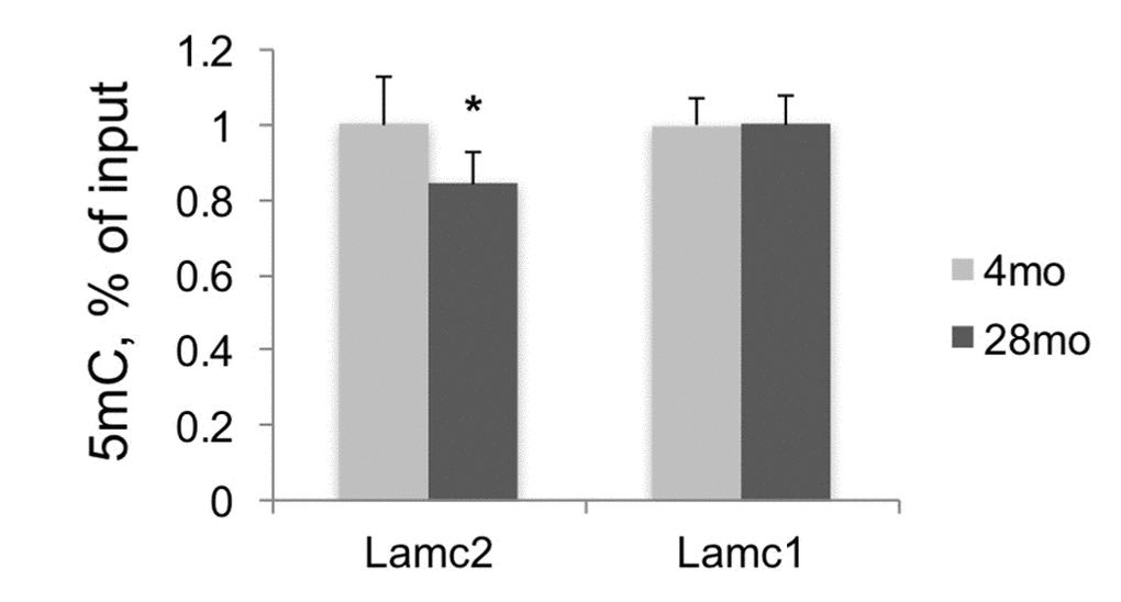 5mC changes during aging were described in different organisms [21–23], and 5mC levels measured at several CpG loci predict human age with very high precision [24,25]. Therefore, along with histone modification changes in aging kidneys, we also estimated 5mC levels at Lamc2 and control genes in DNA purified from the same tissues by using MeDIP assay. This analysis revealed significant losses of 5mC at the 5’ end of Lamc2 gene but no changes at the 5’ end of Lamc1 gene, in old compared to young kidneys (Figure 4). Next, we examined the functional significance of H3K27m3 and 5mC losses for Lamc2 expression.