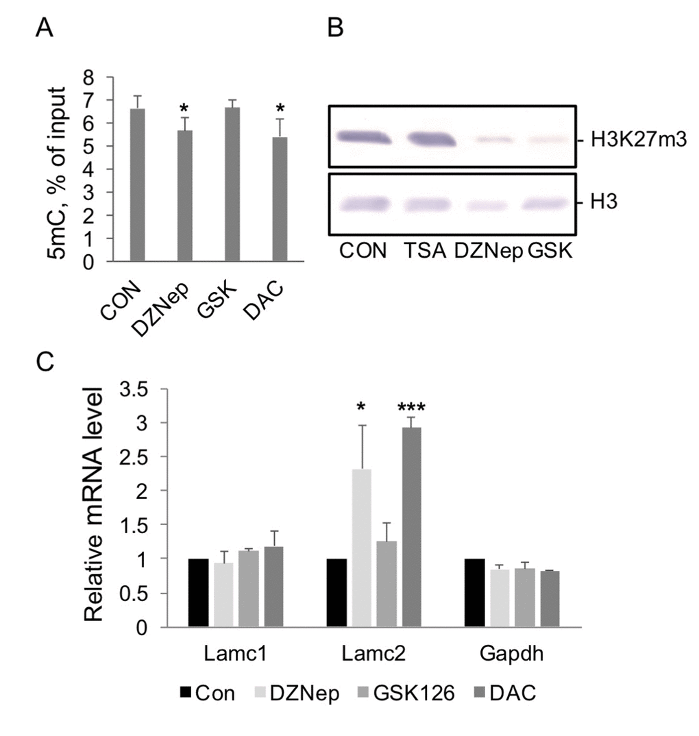 5-aza-2′-deoxycytidine, DAC, is a selective inhibitor of DNA methyl transferases [31]. DAC exposure has also been shown to substantially shorten the lifespan of cells [32]. HEK293 treatment with DAC for 48 hrs decreased DNA methylation levels at Lamc2 gene (Figure 5A) and activated its transcription to the same extent as aging in vivo (compare Figure 5C). Consistent with our suggestion of the role of 5mC loss in the upregulation of Lamc2, DZNep treatment significantly decreased 5mC levels at Lamc2 gene, whereas GSK126 had no effect (Figure 5A).