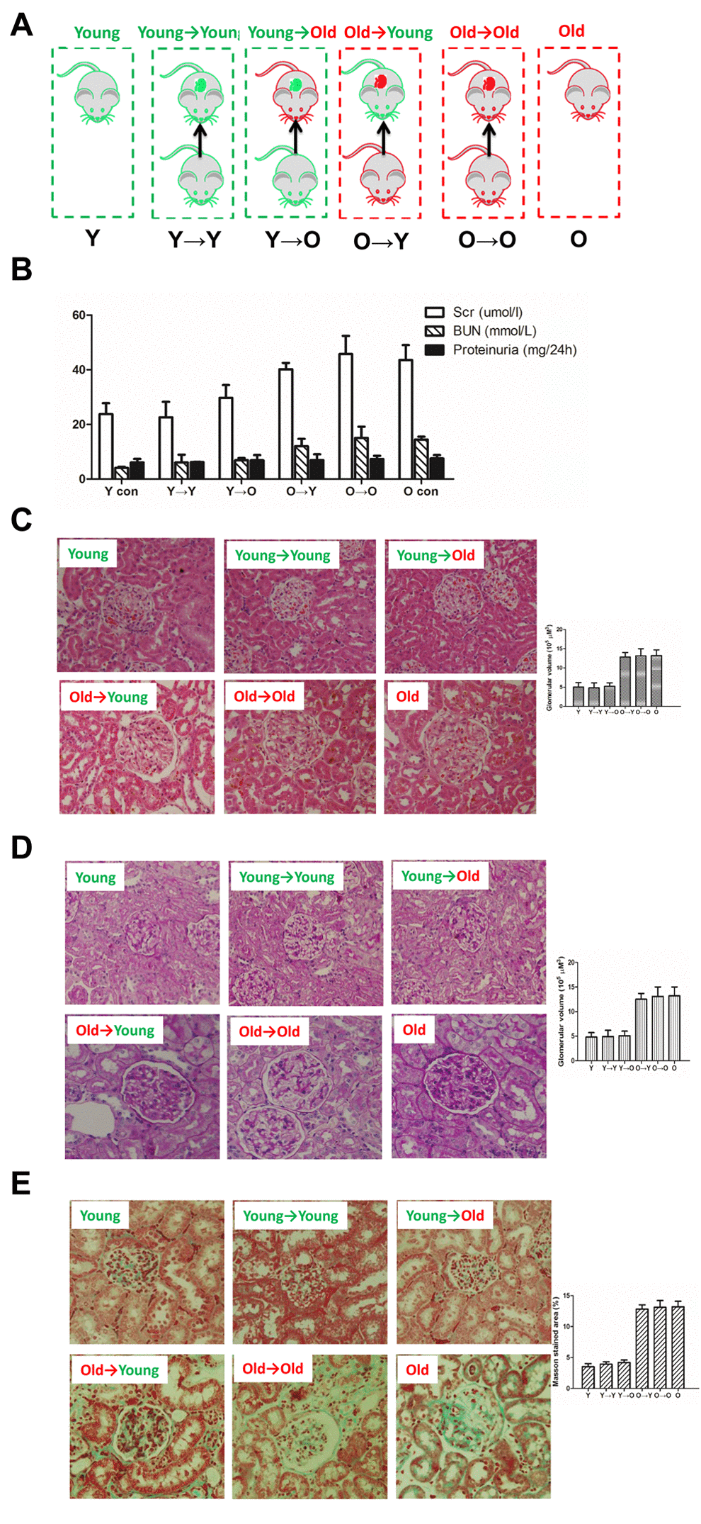As shown in Figure 1B, there was no significant difference in renal function between the O control (O→O) and O→Y rats or between the Y control (Y→Y) and Y→O rats.