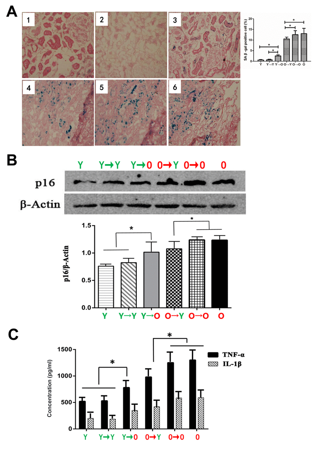 Because renal aging is associated with chronic inflammation, we assessed expression of two inflammatory cytokines, TNF-α and IL-1β, in the four groups. We found that levels of TNF-α and IL-1β were higher in the Y→O than the Y→Y group, and were lower in the O→Y than the O→O group (Figure 2C).