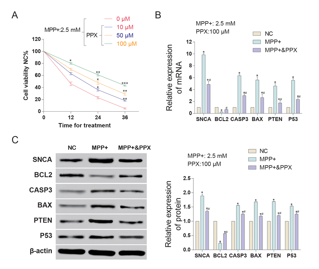After 12 h treatment of 2.5 mM MPP+ with 10, 50, or 100 μM PPX, the viability of SH-SY5Y cells was identified via MTT assay. 1 mg MTT was added to each milliliter of medium and incubated at 37°C for 4 h. After 4 h, the medium in the plate was discarded, and in each well, 200 μL dimethyl sulfoxide (DMSO) was added before 1-min shaking for dissolution in a microplate reader (Bio-Rad Model 680; Bio-Rad, Hercules, CA, USA). The absorbance of cells in each well was measured at 570 nm, and the cell growth curve was drawn based on an average of five wells. The experiment was repeated in triplicate.