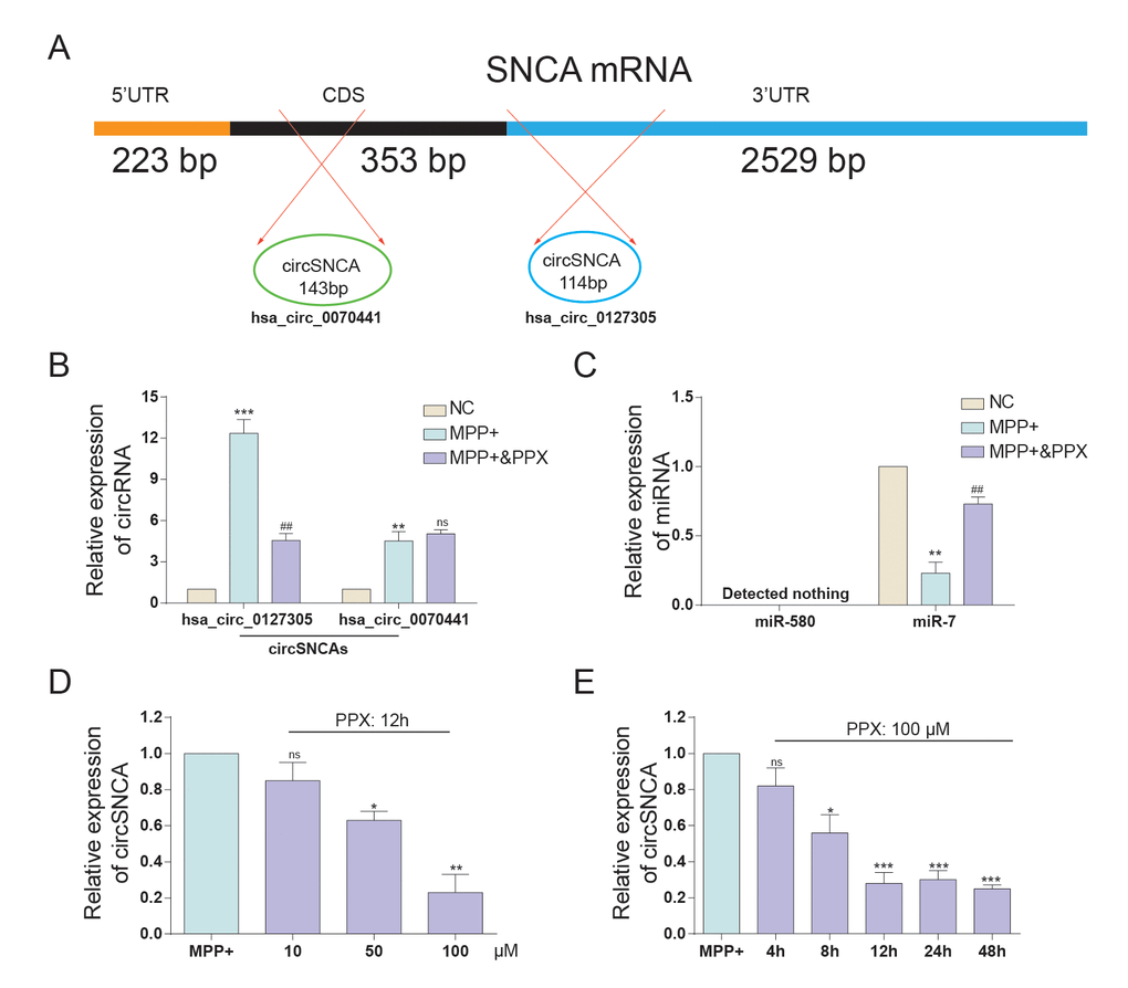 SNCA mRNA and circSNCA are homology-dependent genes. Hsa_circ_0070441 (143 bp) matures from the CDS region of SNCA mRNA, and hsa_circ_0127305 (114 bp) matures from the 3’UTR of SNCA (Figure 3A). According to qRT-PCR analysis, both had higher expression levels after being treated with MPP+, while the former responded more drastically. When being treated with both MPP+ and PPX, the hsa_circ_0127305 level decreased but was still higher than that of NC. However, there was no significant difference between the MPP+ and MPP+ & PPX groups for hsa_circ_0070441 (Figure 3B). Targeted miRNAs of hsa_circ_0127305, miR-580 and miR-7 were predicted using Circular RNA Interactome algorithm [14]. The relative expression of miR-580 was not detected, and miR-7 was significantly reduced in the MPP+ group compared with NC group. The level of miR-7 was the highest in the MPP+ & PPX group compared with the MPP+ group (Figure 3C). We also tested the circSNCA RNA level under different concentrations of PPX and treatment times (Figure 3D and 3E). The circSNCA level decreased with the increase in the PPX concentration (Figure 3D). For the treatment time, after the first 4 h after PPX treatment, no significant change was evident; however, 8 h after PPX treatment, the circSNCA level decreased, and 12 h after the treatment, the level of circSNCA decreased to the lowest level and remained stable thereafter (Figure 3E).
