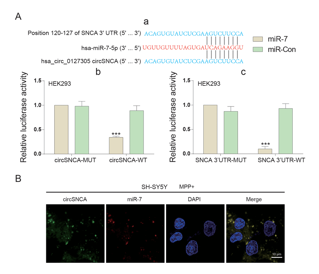 3×104 SH-SY5Y cells were plated onto slides for 24 h of growth in advance of the probe transfection experiments. 20 nM probes of FITC-labeled circSNCA or Cy3-labeled miR-7 (Sangon Biotech) were co-transfected into SH-SY5Y cells for 36 h. After culture incubation, the cells were digested by trypsin and fixed onto slides. The nuclei were stained with DAPI, and the images were collected using fluorescence microscopy (Carl Zeiss, Jena, Germany).