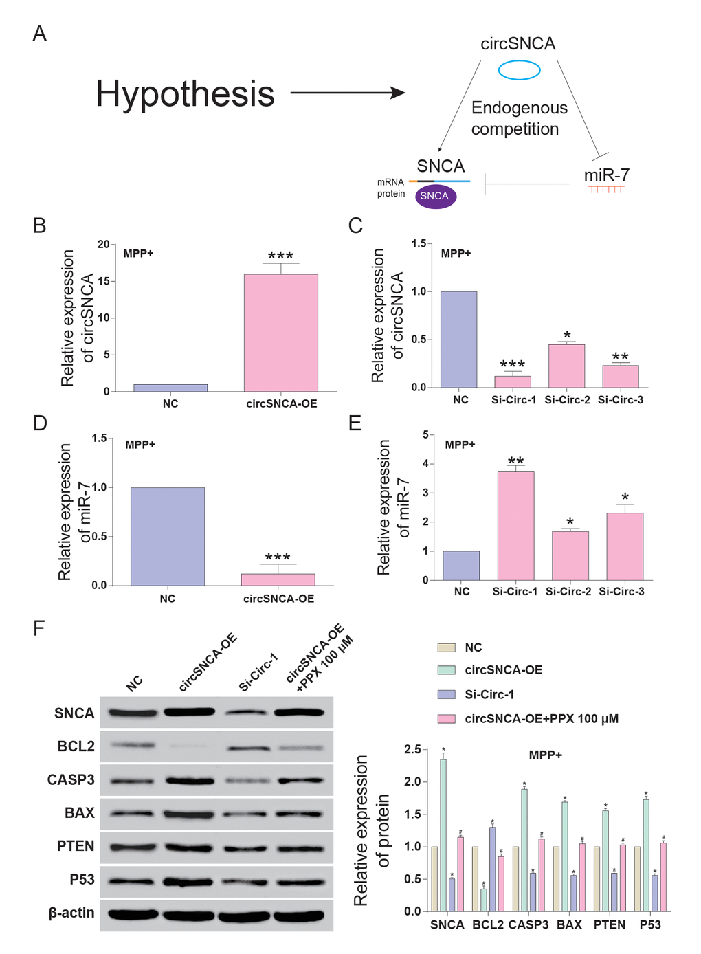 CircSNCA and SNCA 3’UTR had the same target sites of the miR-7 seed region (Figure 4A-a). Double luciferase reporter assays were performed to detect the relationship between circSNCA and miR-7 or miR-7 and SNCA mRNA (Figure 4A-b and c). The dual luciferase reporter gene assay results demonstrated that only when circSNCA-WT and SNCA 3’UTR–WT were co-transfected with miR-7 was there a sharp reduction in luciferase activity (Figure 4A-b and c). Specific probes for detecting circSNCA (green dots) and miR-7 (red-dots) were transfected into SH-SY5Y cells to evaluate the space sites of circSNCA and miR-7 (Figure 4B). Both green dots and red dots were located in the cytoplasm of SH-SY5Y, with strong space overlap. These two experiments implied that there was endogenous competition between circSNCA and SNCA mRNA for miR-7 binding (Figure 5A). To test this hypothesis, we either overexpressed or knocked down circSNCA to investigate how circSNCA regulated miR-7 expression (Figure 5B and 5C). With circSNCA overexpression, the miR-7 level decreased, while with circSNCA knockdown, the miR-7 level increased (Figure 5D and 5E). Compared to the siRNAs (Si-Circ-1, Si-Circ-2, Si-Circ-3) for circSNCA, Si-Circ-1 showed the best effects on circSNCA knockdown. Western blot showed that in the MPP+ group, SNCA expression was enhanced with circSNCA overexpression, declined with circSNCA knockdown, and slightly increased with both circSNCA overexpression and PPX treatment, compared to the NC group. Similar results were observed in terms of CASP3, BAX, PTEN and P53 expression, while opposite results were observed for BCL2 (Figure 5F). It could be speculated and concluded that PPX had a negative regulation effect on the expression of SNCA and pro-apoptotic proteins and a positive regulatory effect on anti-apoptotic proteins. CircSNCA could attenuate the therapeutic effects of PPX in an in vitro PD model.