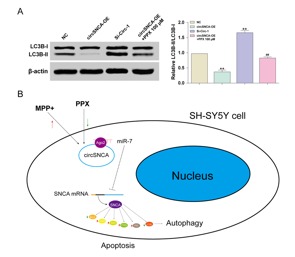 Furthermore, autophagy-associated protein, LC3B, was also detected by western blot. The LC3B-I level showed no significant change to circSNCA overexpression/ knockdown or PPX treatment. However, the LC3B-II level was low with circSNCA overexpression, high with circSNCA knockdown and slightly low with both circSNCA overexpression and PPX treatment (Figure 6A). To conclude, MPP+ induced an increase in circSNCA in a PD cell model, while PPX reversed it (Figure 6B). The upregulation of circSNCA could sponge and degrade miR-7 through the target sequences and Ago2, which may lead to attenuated inhibition of miR-7 on SNCA mRNA and the increased expression of SNCA. CircSNCA upregulation also positively correlated with the increasing expression levels of pro-apoptotic proteins (CASP3, BAX, PTEN and P53) and the decreasing levels of anti-apoptotic protein BCL2 and autophagy-associated protein LC3B-II.