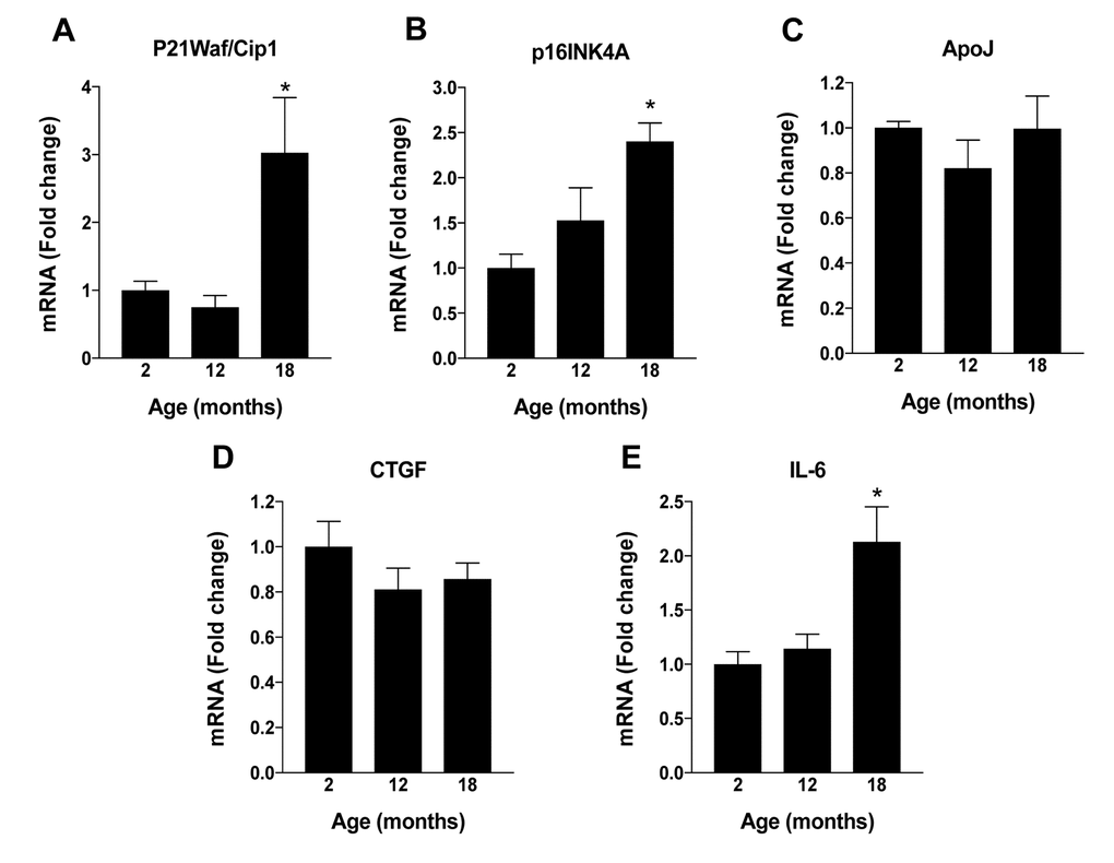 Protein was extracted from RPE/eyecup of mice (2, 12 and 18 months old) or ARPE-19 cells or primary RPE cells using RIPA cell lysis buffer (Thermo Scientific) containing protease and phosphatase inhibitors and concentration was determined using the coomassie protein assay reagent (Sigma-Aldrich, USA). Equivalent amount of protein samples were subjected to SDS–PAGE, transferred to PVDF membranes, and then incubated with primary antibodies: SIRT-1, p21Waf/Cip1 (1:1000; Cell signaling) and p16INK4a (1:500; Abcam) overnight at 4°C. Next day, blots were washed with TBST and incubated with horseradish peroxidase conjugated secondary antibody (1:3000; Sigma-Aldrich, USA) for 60 min with gentle shaking at room temperature. Blots were then washed (with TBST) and developed with chemiluminescence reagent (Bio-Rad, Hercules, CA) using autoradiography films (Genesee Scientific, San Diego, CA). β-actin (1:3000; Sigma-Aldrich, USA) expression was evaluated to determine equivalent loading. Scanned images of blots were used to quantify protein expression using NIH ImageJ software (http://rsb.info.nih.gov/ij/).