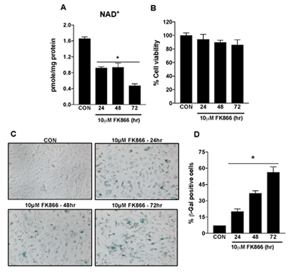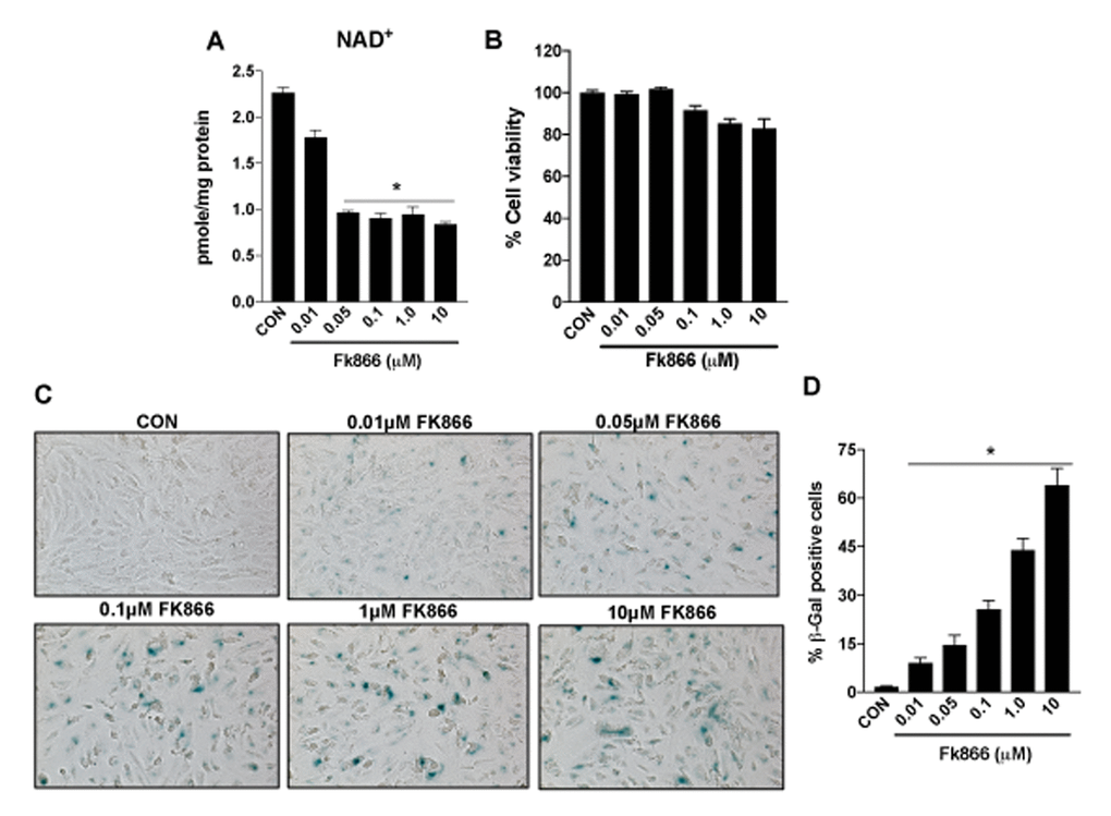 FK866 inhibits NAMPT thereby decreasing NAD+ levels and promoting RPE senescence