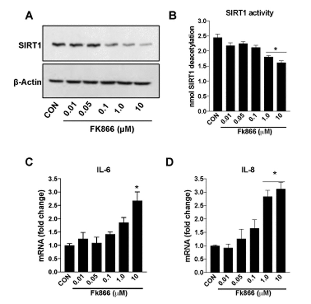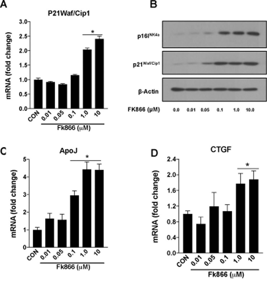 Confluent, well-differentiated cultures of human RPE (ARPE-19) cells were exposed to varying concentrations of FK866 for 72 h. As anticipated, FK866 induced a dose-dependent decline in levels of NAD+ (Fig. 2A). Cell viability assays confirmed the absence of robust cellular toxicity due to FK866 exposure across the range of doses of the compound that were tested (0.01 – 10 μM; Fig. 2B). There was a significant and dose-dependent increase in the number of RPE cells positive for the expression of β-galactosidase, an established marker of cellular senescence, in cells treated with FK866 (Fig. 2C-D), suggesting that while the compound did not induce robust cell death, it did on the other hand, stimulate cellular senescence. To confirm this, we evaluated also the mRNA and/or protein expression of cyclin-dependent kinase inhibitor 1 (p21Waf/Cip1), cyclin-dependent kinase Inhibitor 2A (p16INK4a), apolipoprotein J (ApoJ), and connective tissue growth factor (CTGF), key additional biomarkers of aging and cellular senescence [17–20]. Congruent with β-galactosidase staining, the expression of each of these markers was increased in association with increasing concentrations of FK866 and the associated decline in NAD+ (Fig. 3A-D). Additionally, the expression and activity of SIRT1 was dose-dependently decreased (Fig. 4A-B).