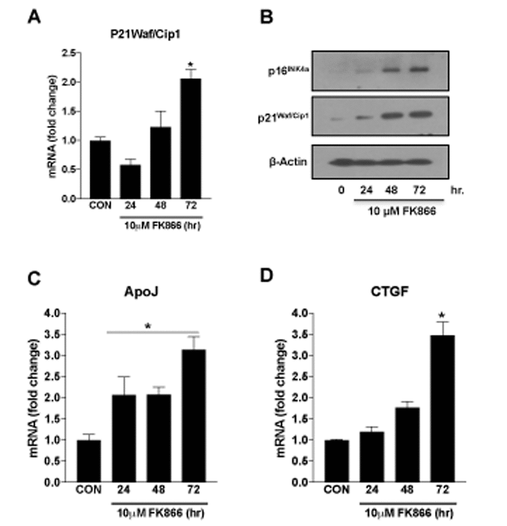 Based upon our immediate prior findings, a dose of 10 µM FK866 was confirmed as the optimal standard dose. To confirm the optimal incubation period for FK866 treatment, additional cultures of ARPE-19 were treated with 10 µM FK866 for 24, 48 or 72 h and parameters identical to those described above (Figs. 2-4) were evaluated. FK866 was effective at reducing NAD+ levels at each of the time points tested, however the greatest efficacy was achieved in association with a 72 h incubation period (Fig. 5A), the time period that was used in our initial studies. Cell viability assays were repeated in these additional batches of cells and the absence of cellular toxicity in cells exposed to 10 µM FK866 at all-time points tested was confirmed (Fig. 5B). β-galactosidase staining and related quantification revealed a time-dependent increase in the number of β-gal-positive cells in FK866-treated cultures (Fig. 5C-D). Similarly, the expression of p21Waf/Cip1, p16INK4a, ApoJ and CTGF was increased (Fig. 6A-D) and SIRT1 expression and activity decreased (Fig. 7A-B) time-dependently, further supporting the optimality of the 72 h incubation period (Fig. 6A-D).