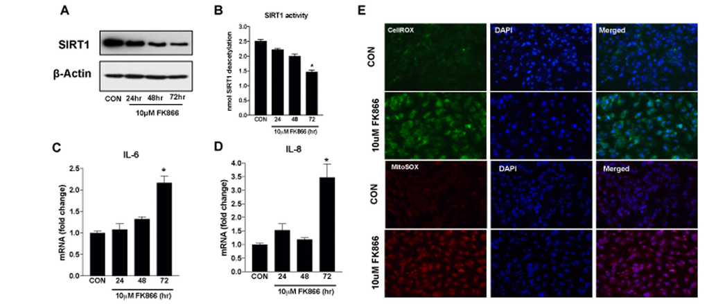 ARPE-19 cells were treated with 10 μM FK866 for 72 hr. as mentioned above. At the end of treatments, cells were incubated for 5 μM CellROX for 30 min or 5 μM MitoSOX for 10 min. At the end of incubation, cells were washed with PBS, mounted using fluoroshield mounting medium with DAPI and images were captured using Zeiss Axioplan-2 imaging florescence microscope.