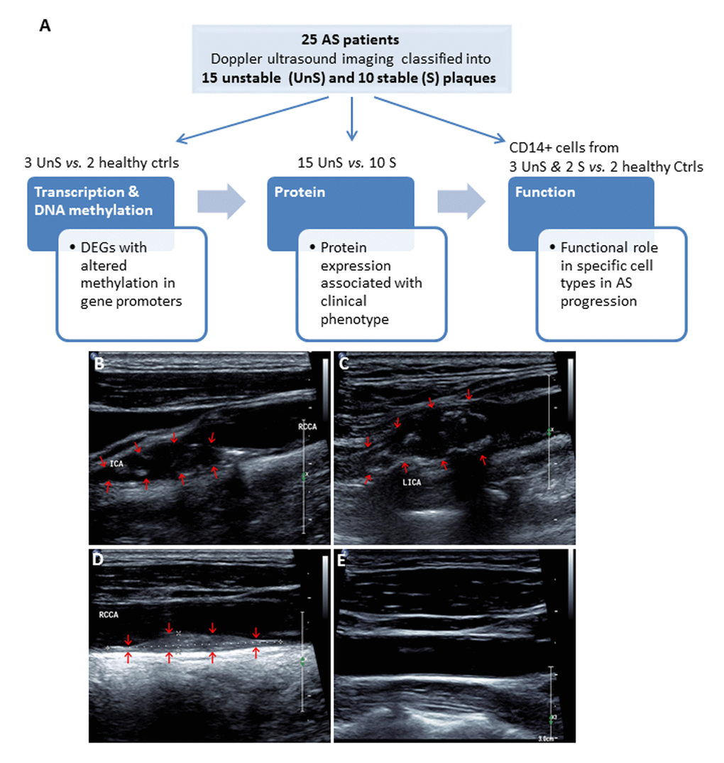 A total of 25 consecutive patients undergoing carotid endarterectomy for AS were enrolled in Liaocheng People's Hospital of Taishan Medical University between June 2010 and Jan 2016 (Fig. 1A). All patients underwent Doppler ultrasound imaging for the carotid plaques before endarterectomy. The carotid atherosclerotic plaques were classified as complex lesion or UnS plaques and noncomplex or S plaques (Fig. 1B-D). Image of a healthy subject carotid artery demonstrates intima-media with no plaques and normal blood flow (Fig. 1E).