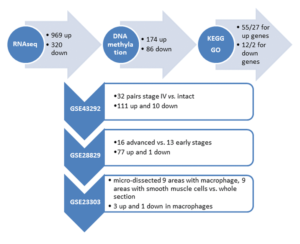 Atherosclerosis (AS), characterized by atheromatous plaques in the intima of the large arteries, is an underlying cause of many cardiovascular diseases, including heart attack and stroke, and the leading cause of death and morbidity among adults worldwide [1]. It is widely accepted that AS is a complex multifactorial disease with genetic, epigenetic and environmental factors associated to the disease progression [2]. In recent years, numerous genome-wide association studies with AS have identified several risk loci for AS associated genes [3]. While these studies provided an initial look into the genetic architecture of AS, most of the loci showed inconsistent results between different studies [3]. Genetic risk factors can explain only a little portion of the observed inheritance of AS [4]. The small genetic variance for AS could be due to environmental factors and/or epigenetic regulation. Indeed, emerging studies have implicated epigenetic regulation in the etiology of AS, including DNA methylation, histone post-translational modifications and microRNAs [5]. DNA methylation is the most stable epigenetic mark that confers persisting changes in gene expression [6,7]. Although a significant level of decreased genomic DNA methylation was identified in human atherosclerotic lesions [8], a further exploration of DNA methylation in regulating gene transcription in a cell type- and stage-specific manner is warranted, and such study will shed light on understanding the biological processes associated with AS severity and plaque stability.