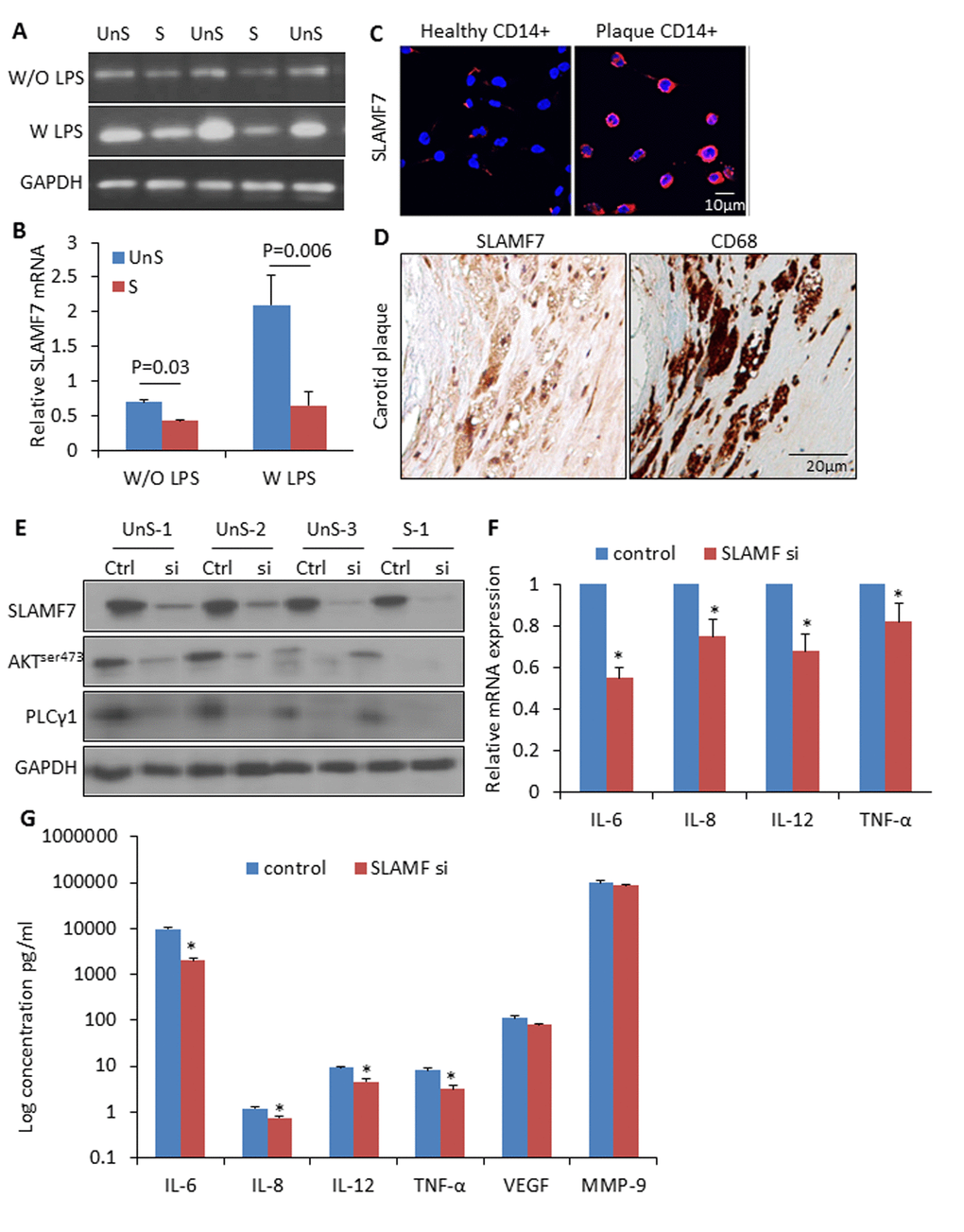 We isolated CD14+ myeloid cells (i.e. monocytes and macrophages) from human atherosclerotic plaques and healthy donors’ blood, and cultured them with or without lipopolysaccharides (LPS) (10ng/ml). SLAMF7mRNA showed a 1.6-fold higher expression in the plaque CD14+ myeloid cells than in the control cells without LPC stimulation, and a 3.2-folde higher after LPS induction for 3 hours (Fig. 4A-B). SLAMF7 protein was examined on both cellular surface and cytoplasm of the plaque CD14+ cells in vitro and in vivo (Fig. 4C-D). Transduction with specific siRNAs targeting SLAMF7 in the UnS plaque-derived CD14+ cells for 24 hours resulted in a significant reduction of proinflammatory cytokines interleukin-6 (IL-6), IL-8, IL-12 and tumor necrosis factor alpha (TNF-α) (p<0.05), mediated by the SLAMF7 downstream protein kinase B (PKB, also known as AKT) and phosphoinositide phospholipase C (PLCγ1) signalings (Fig. 4E-G).