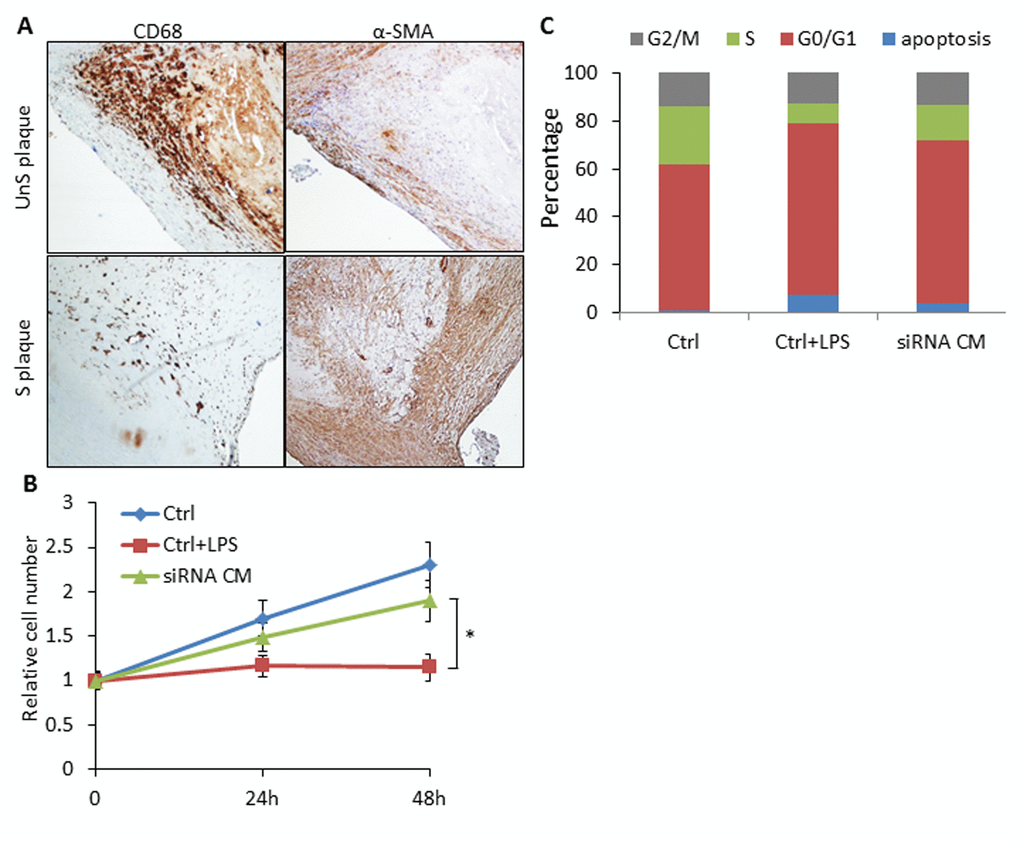 UnS plaques were characterized by lower prevalence of VSMCs compared to the CD68-positive macrophages in contrast to what observed in S plaques [9], especially in the shoulder area of the plaque where rupture occurs most commonly [11] (Fig. 5A).To explore whether SLAMF7 from macrophages may interfere with VSMCs biology, we collected conditioned medium (CM) from SLAMF7siRNA transduced CD14+ myeloid cells from 3 UnS plaques (siRNA CM), and assessed the effects of CM on VSMCs proliferation and cell cycle. We found that CM from the CD14+ myeloid cells activated with LPS induced the inhibition of VSMC proliferation, as tested by cell count. Conversely, VSMCs treated with SLAMF7siRNA CM showed a significant increase of cell proliferation at both 24 and 48h compared to LPS control medium (Ctrl+LPS) (p<0.05) (Fig. 5B). Cell cycle analysis further indicated that SLAMF7siRNA CM induced the increase of cell percentages in S-phage (from 8.37±1.82% to 15.05±2.36) and decrease in both G0/G1 and apoptotic phases (from 71.67±2.62% to 67.91±2.94% for G0/G1 and from 7.38±2.45% to 3.72±1.28% for apoptosis) (Fig. 5C). These results indicate that SLAMF7 plays a stimulatory role in releasing proinflammatory cytokines in plaque macrophages, and further affects the proliferation and apoptosis of VSMCs, contributing to the progression of unstable AS.