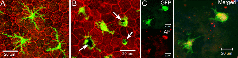 Under normal physiological conditions, RPE cells can suppress macrophage activation through pigment epithelial-derived factor (PEDF) [21–23] and α-melanocyte stimulating hormone (α-MSH) [24]; whereas, under disease conditions, particularly when RPE cells undergo apoptotic death, the dead RPE cells can induce an angiogenic phenotype in macrophages [25]. Although substantial RPE death unlikely occurs in the normal aging eye, the cells are subjected to chronic oxidative stress and are constantly undergoing morphological remodeling [16]. The ability of RPE cells to modulate macrophage function in the subretinal space may depend on the condition of RPE cells. Indeed, subretinal macrophages in the healthy adult eyes (6 -12 months old) often have a small soma and long- fine-dendrites (Fig. 1A), whereas the cells in the aging eye (20 – 27 months) have a large cell body that often contains pigmented debris (Fig. 1B) [15], and they are autofluorescent (Fig. 1C) [17]. This suggests that they are active phagocytizing debris released by stressed RPE cells. In this study, we investigated the effect of different types of RPE cells in macrophage complement expression, including normal RPE cells, oxidized photoreceptor outer segments (oxPOS) pre-treated or TNF-α pre-treated RPE cells and apoptotic RPE cells.