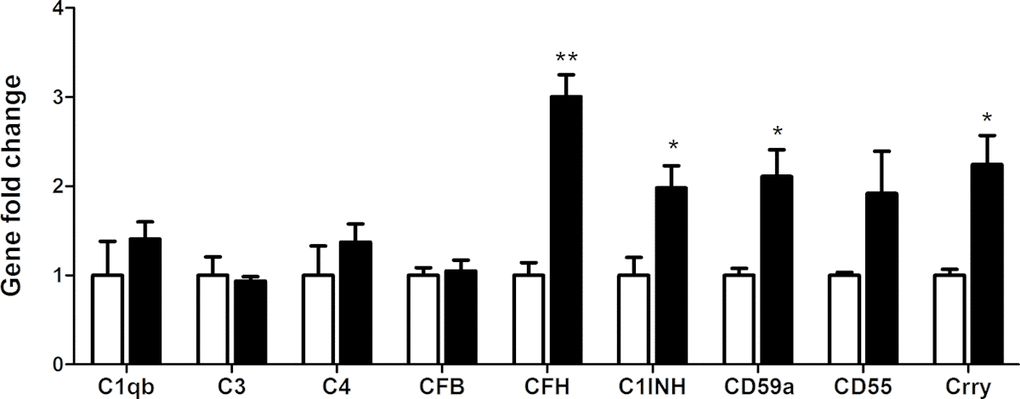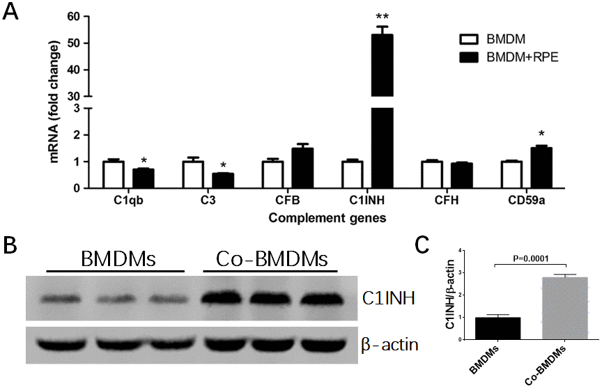 Previously we have shown that macrophages express a variety of complement components and regulatory genes [20]. In this study, we selectively investigated complement genes that were expressed at reasonable levels in macrophages in our previous study, including c1qb and c1inh of the classical pathway, cfb and cfh of the alternative pathway, and c3 and cd59a of the terminal pathway. When BMDMs were co-cultured with normal RPE cells, the expression of C1qb and C3 mRNA was significantly reduced (Figure 2), whereas the mRNA expression of CD59a, particularly C1INH was markedly increased (1.85-fold and 53.07-fold respectively) (Figure 2A). The upregulation of C1INH was further confirmed at protein level by Western Blot (Figure 2B, 2C). The expression of CFB and CFH was not affected. C1INH and CD59a negatively regulate complement activation. Our result suggests that under normal physiological conditions, RPE cells may suppress complement activation at the retina—choroid interface by modulating subretinal macrophage complement expression.