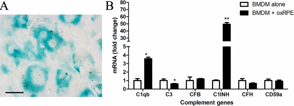 Our recent work suggests that oxidized POS (oxPOS) suppresses RPE proliferation and induces multinucleation, a phenotype that is similar to RPE cells in the aging eye [16]. In this study, we further found that oxPOS treatment induced β-galactosidase expression in RPE cells (Figure 3A), an indicative of cell senescence. When BMDMs were co-cultured with oxPOS pre-treated RPE, the expression of C1qb increased by more than 3-fold. The expression of C1INH remained at high levels (49.36-fold increment) compared with untreated BMDMs, whereas the expression of C3 was significantly decreased (Figure 3B). The expression of other genes, including CFB, CFH, and CD59a was not affected (Figure 3B). C1q is involved not only in the CP complement activation, but also in phagocytosis [26]. Our results suggest that, RPE cells in the aging eye may suppress complement activation through macrophage related C1INH and promote subretinal macrophage phagocytosis by enhancing C1q expression.