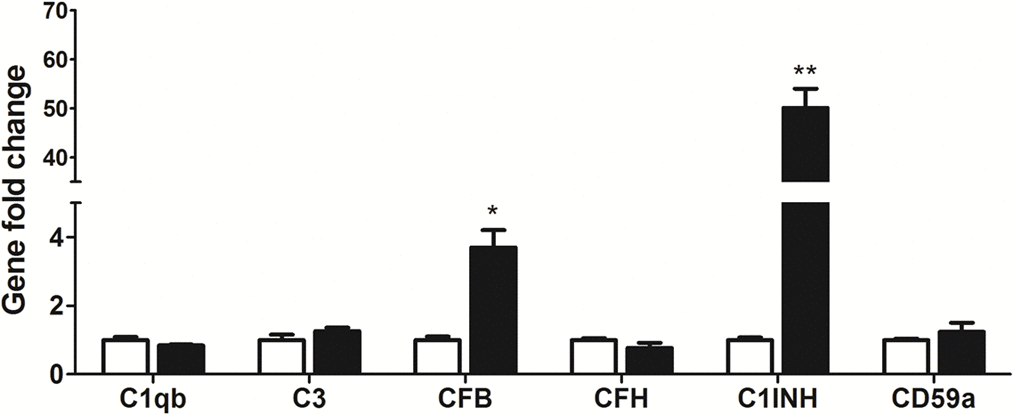 TNF-α is one of the key inflammatory mediators in the inflamed eye e.g., uveoretinitis [27–29]. When BMDMs were co-cultured with TNF-α pre-treated RPE cells, the expression of CFB and C1INH was increased by 3.7-fold and 50.1-fold respectively (Figure 4), whereas other complement component genes, including C1qb, C3, CFH and CD59a remained unchanged (Figure 4). The result suggests that under inflammatory conditions, RPE cells may convert macrophages into a phenotype that can promote complement activation through the alternative but not the classical or MBL pathway.
