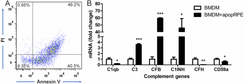 Apoptotic RPE cells were induced by exposing cells to 1mM H2O2 in serum-free DMEM overnight at 37°C [30]. Flow cytometry analysis confirmed that ~90% RPE cells were Annexin V+ or Annexin V+PI+ (Figure 5A). When BMDMs were incubated with apoptotic RPE cells, the expression of C3, CFB and C1INH was upregulated by 3.58-fold, 59.63-fold and 45.76-fold respectively, whereas the expression of C1q, CFH and CD59a was down-regulated to 0.20-fold, 0.03-fold and 0.55-fold (compared to BMDM alone) respectively (Figure 5B). The result suggests that apoptotic RPE cells may promote AP complement activation in subretinal macrophages.