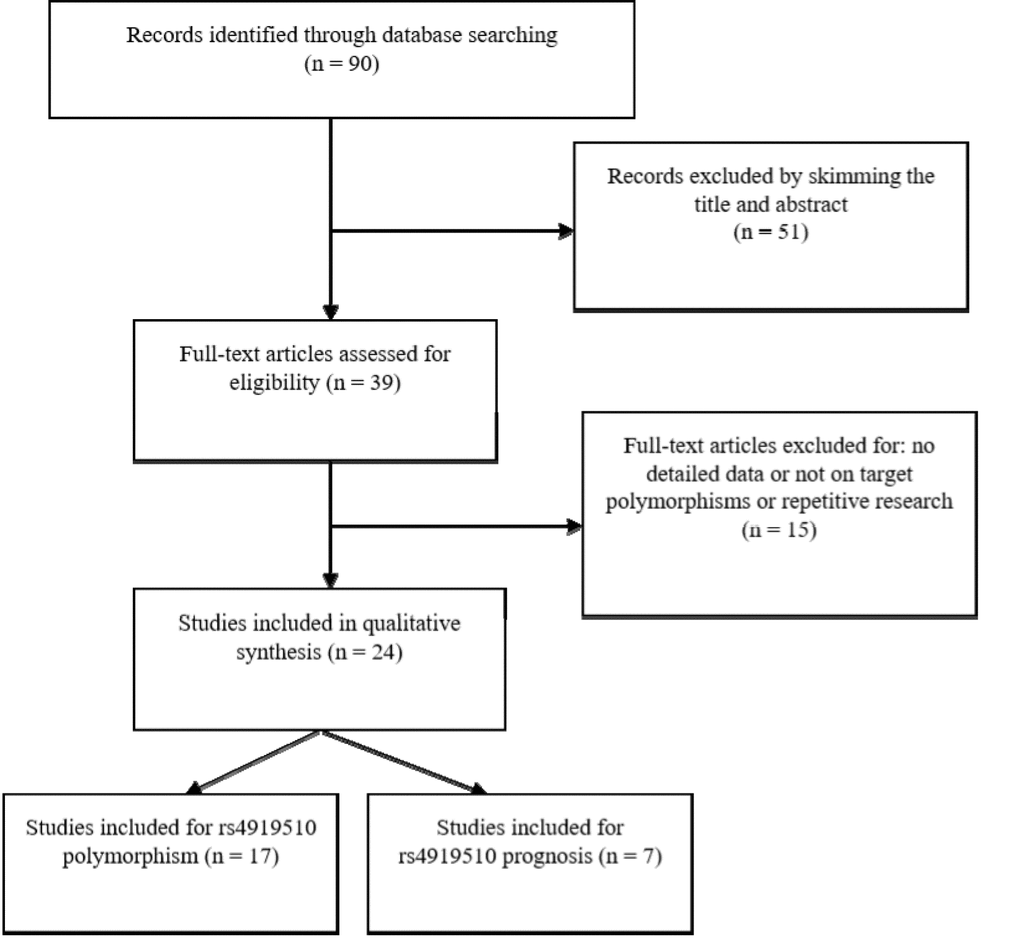 Studies that fit into our meta-analysis fell into one of the following categories: (1) evaluation of the association of rs4919510 polymorphism and cancer susceptibility and/or prognosis; (2) provision of sufficient data to estimate the odds ratio (OR) or hazard ratio (HR) and 95% confidence intervals (CI) according to rs4919510 polymorphism; (3) case-control design; (4) controls without any evidence of malignant disease. The following were the exclusion criteria: (1) repeats studies, reviews, and abstracts; (2) the study did not have a control group; (3) design based on family; (4) the control population was not conformed the requirements of Hardy-Weinberg Equilibrium. The diagnosis of each cancer in eligible study was made based on the histopathological evidence and those with secondary tumour or metastasized cancer from other organs were excluded. Two investigators (Z-MD and J-RL) retrieved the literature and extracted data from each eligible study independently.
