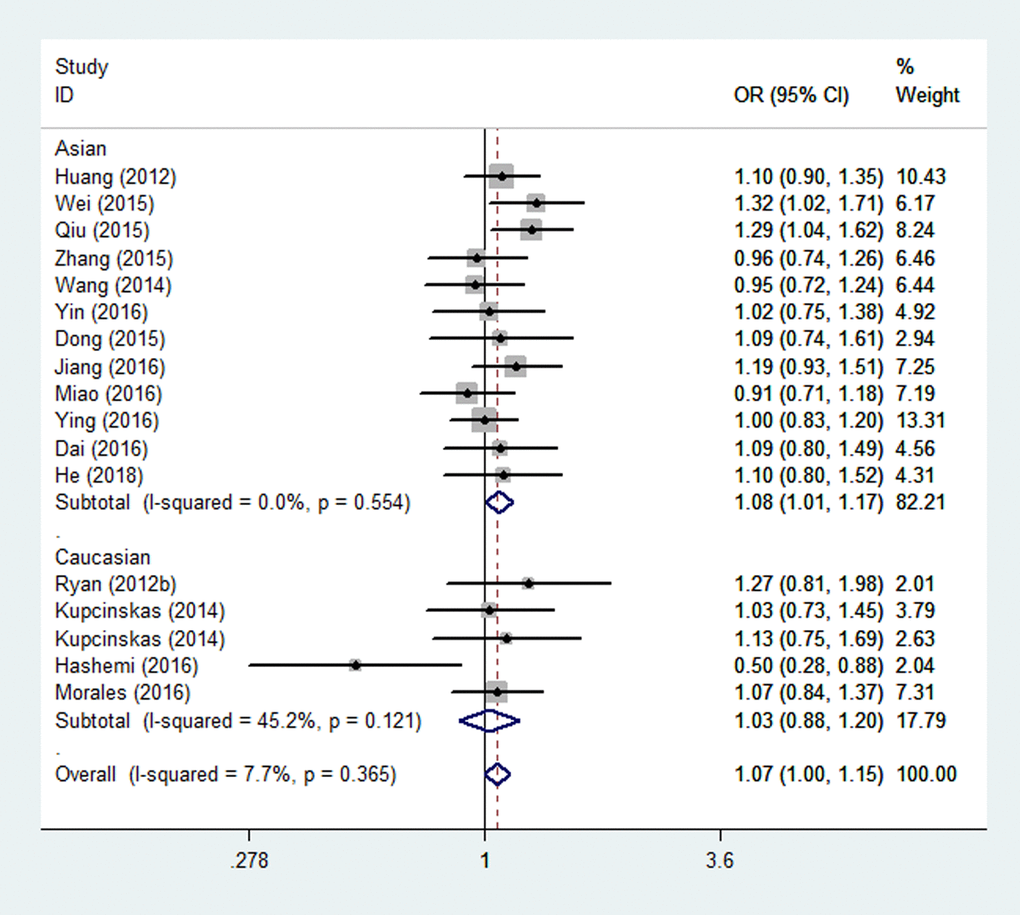 | Caucasian | 1.08 (0.89-1.32) | 0.45 | 51%, 0.09 | 1.36 (0.98-1.87) | 0.06 | 0, 0.64 | 1.31 (0.96-1.80) | 0.09 | 0, 0.61 | 1.05 (0.83-1.32) | 0.69 | 50%, 0.09 | 1.03 (0.88-1.20) | 0.75 | 45%, 0.12 | ||||||||||||||||||||||||||||||||||||||||||||||||||||||||||||||||||||||||||||||||||||
