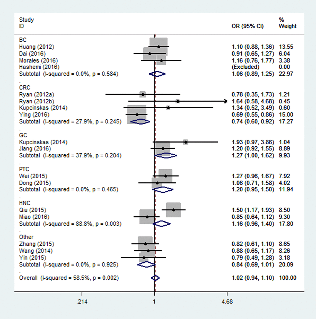 | OR: odds ratio; CI: confidence interval; BC: breast cancer; CRC: colorectal cancer; GC: gastric cancer; PTC: papillary thyroid cancer;HNC: head and neck cancer. | |||||||||||||||||||||||||||||||||||||||||||||||||||||||||||||||||||||||||||||||||||||||||||||||||||