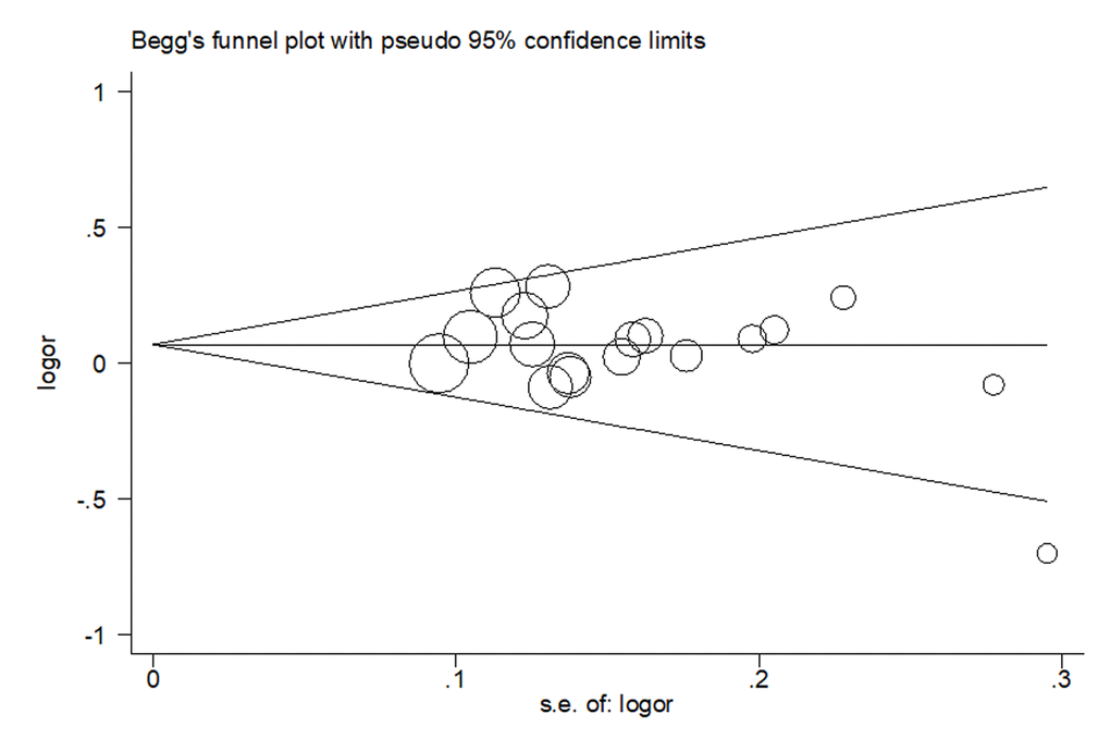In our meta-analysis, both Begg’s funnel plot and Egger’s test were conducted to assess the publication bias. As shown in Fig. 4, the results revealed no publication bias for eligible studies under heterozygous model. The symmetry was then confirmed in Egger’s linear regression test (P = 0.21).