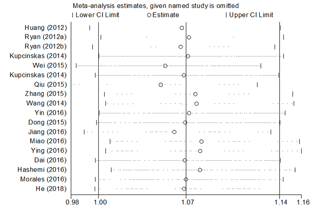 Significant heterogeneities in the data of microRNA-608 rs4919510 polymorphism were observed in the overall meta-analysis as well as subgroup analysis, the results are shown in Table 3. Sources of heterogeneity were further studied by sensitivity analysis, the result showed that no individual study influenced the pooled OR value (Fig. 5), indicating that the results of our meta-analysis are statistically credible and robust.