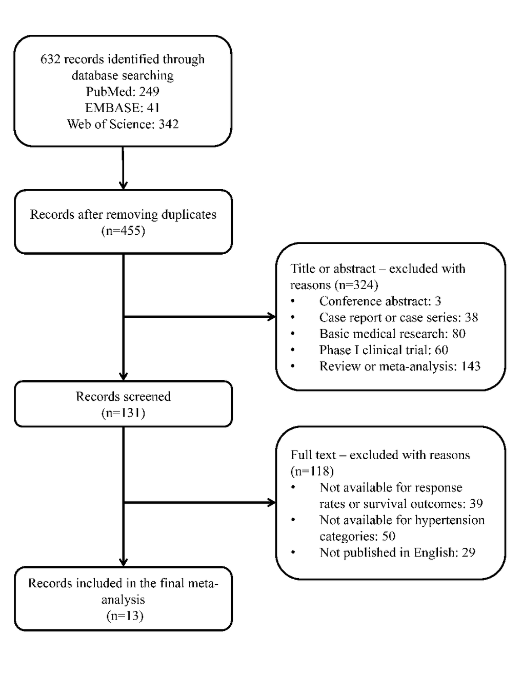 A systematic literature search was conducted in the following electronic bibliographic databases: PubMed (Medline), EMBASE (Excerpta Medica dataBASE) and Web of Science (Science Citation Index and Social Sciences Citation Index). Search strategy was expressed in the Boolean style, that is, (“colon” or “colorectal” or “rectal” or “rectum”) and (“cancer” or “tumor” or “tumour” or “carcinoma” or “neoplasm”) and (“bevacizumab” or “avastin”) and (“hypertension” or “blood pressure”). The literature search was completed on February 17, 2018. The reference lists of two previous meta-analyses [16,17] and retrieved major articles were also checked for potential missing hits. A final reference list of 632 articles was determined.