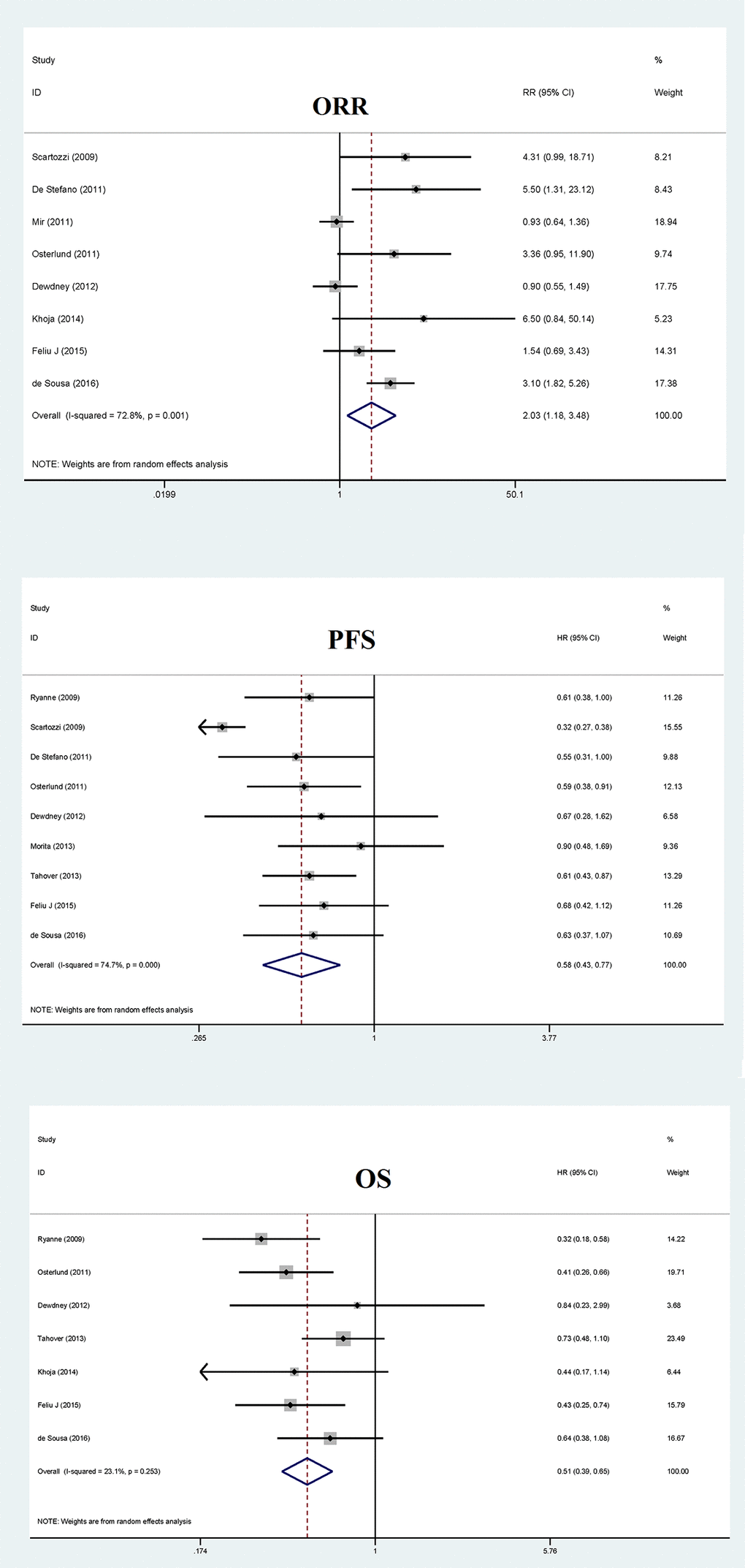 | Abbreviations: ORR: objective response rate; PFS: progression free survival; OS: overall survival; RE: risk estimate; 95% CI: 95% confidence interval; OR: odds ratio; HR: hazard ratio; I2: inconsistency index; CTC: common terminology criteria; AE: adverse events; NA: not available. | |||||||||||||||||||||||||||||||||||||||||||||||||||||||||||||||||||||||||||||||||||||||||||||||||||