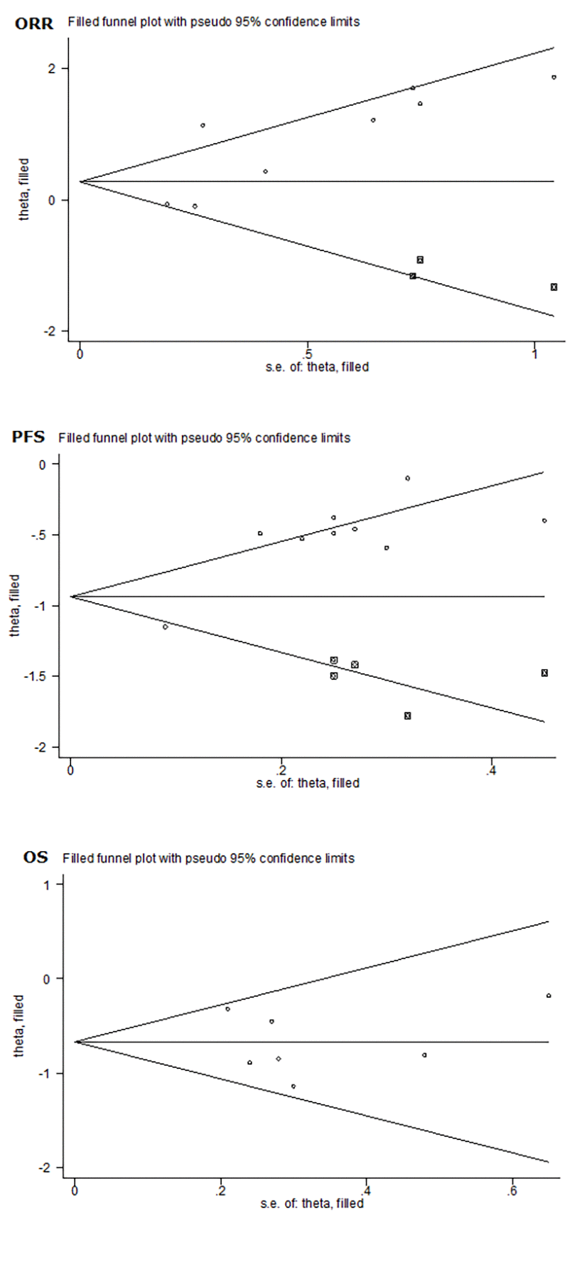 As shown in Figure 3, filled funnel plot for progression-free survival detected five potentially missing studies, and the associated Egger’s test was remarkably significant (p=0.001). After adjusting for the five missing studies, the hazard ratio of progression-free survival was still significant (hazard ratio: 0.52, 95% CI: 0.41 – 0.66, p<0.001). In cumulative meta-analysis, a stable trend in risk estimates was noted for progression-free survival (SSupplementary Figure S1).