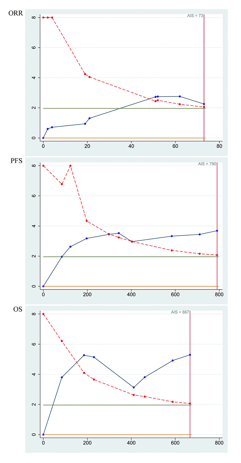 Finally, trial sequential analysis was employed to minimize random errors for objective response rate, progression-free survival and overall survival, respectively (Figure 4). The three cumulative z-curves were noticed to cross trial sequential monitoring boundaries prior to reaching the required information sizes, which suggested adequate cumulative evidence and the robustness of our conclusions.