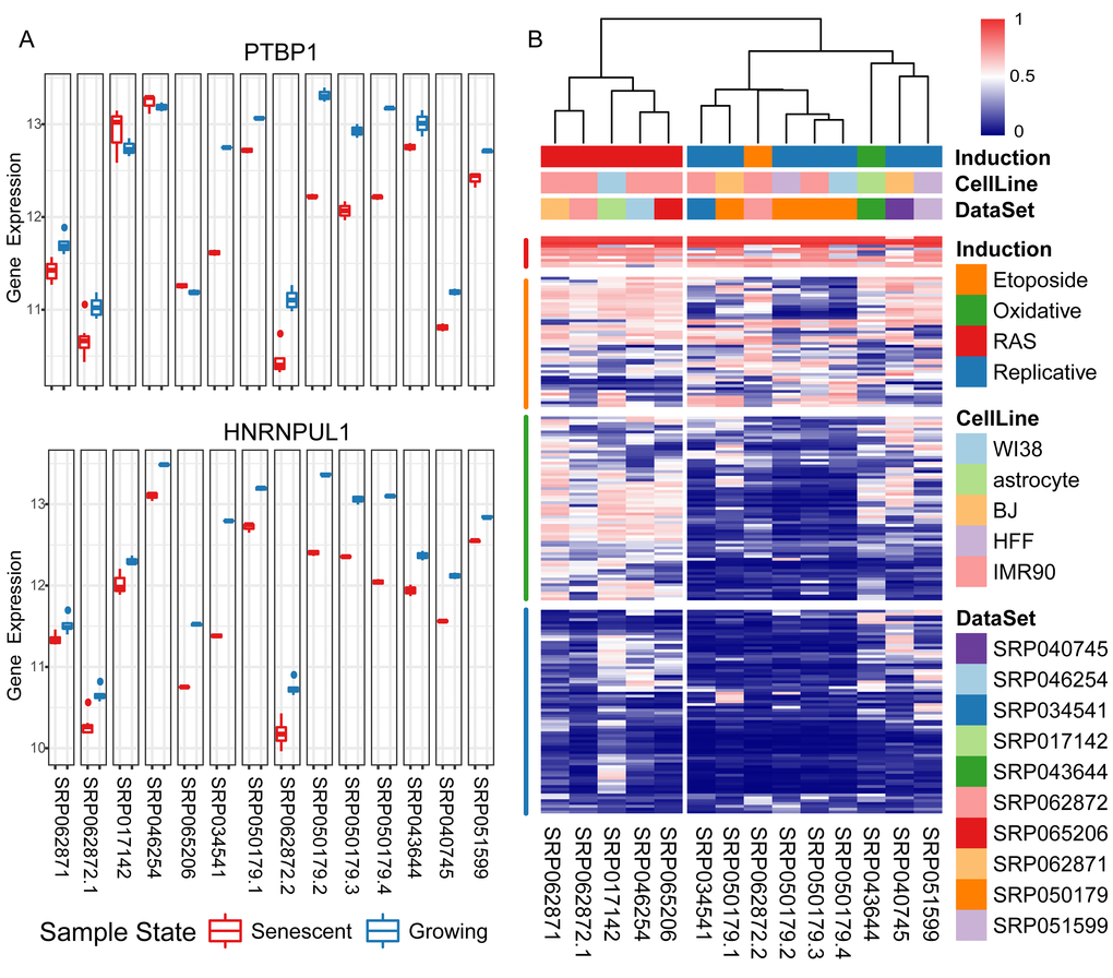 Functional roles of the differentially expressed genes were revealed via Gene Ontology (GO) enrichment analysis (Figure S1C, Table S4). As expected, top enriched Biological Process (BP) GO terms were associated with ageing or cellular senescence. Down-regulated genes were enriched in the processes of cell division, DNA replication, DNA repair, etc., while up-regulated genes were enriched in the processes associated with proton transport, autophagy, etc. Interestingly, biological processes associated with mRNA splicing were listed among the top significantly enriched down-regulated ones. RBP genes, major controllers in regulating mRNA post-transcription, showed aberrantly expression in senescent samples compared with growing ones. Among the 192 RBPs, collected in this study (Materials and Methods), 22.1% were significantly down-regulated in senescent samples (p-value = 2.53e-19, odds ratio = 6.629) (Table S5). Taking PTBP1 and HNRNPUL1 as examples shown in Figure 1A, their gene expression levels are consistently down-regulated in senescent samples in multiple experiments.